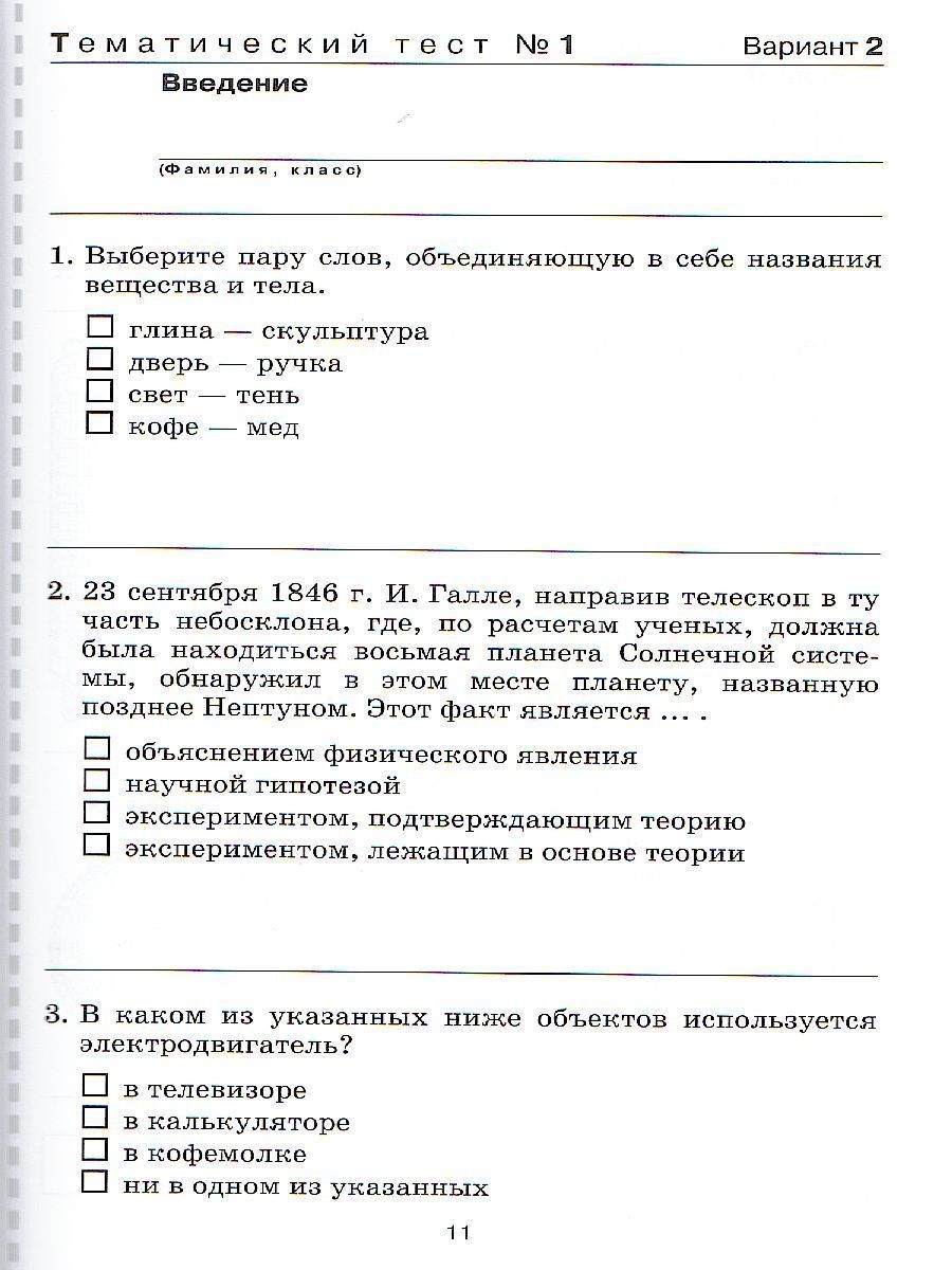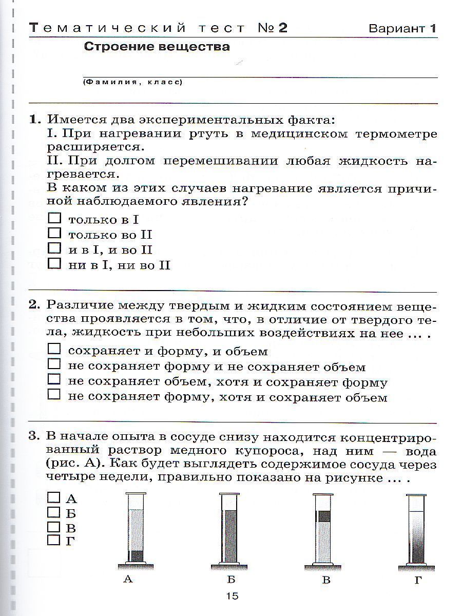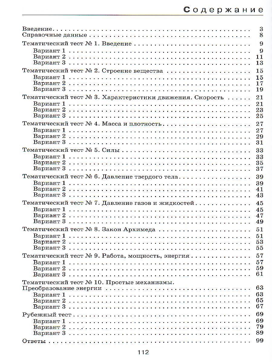 Пособие представляет собой сборник тестов для тематического и рубежного контроля. Может быть использовано как при работе с учебником, соответствующим ФК ГОС, так и при работе с учебником, соответствующим ФГОС. Тесты для текущего контроля составлены по темам «Введение», «Строение вещества», «Характеристики движения. Скорость», «Масса и плотность», «Силы», «Давление твердого тела», «Давление газов и жидкостей», «Закон Архимеда», «Работа, мощность, энергия», «Простые механизмы. Преобразование энергии». Цель рубежного теста — проверить достижение предметных и метапредметных результатов, установленных ФГОС.Характеристики