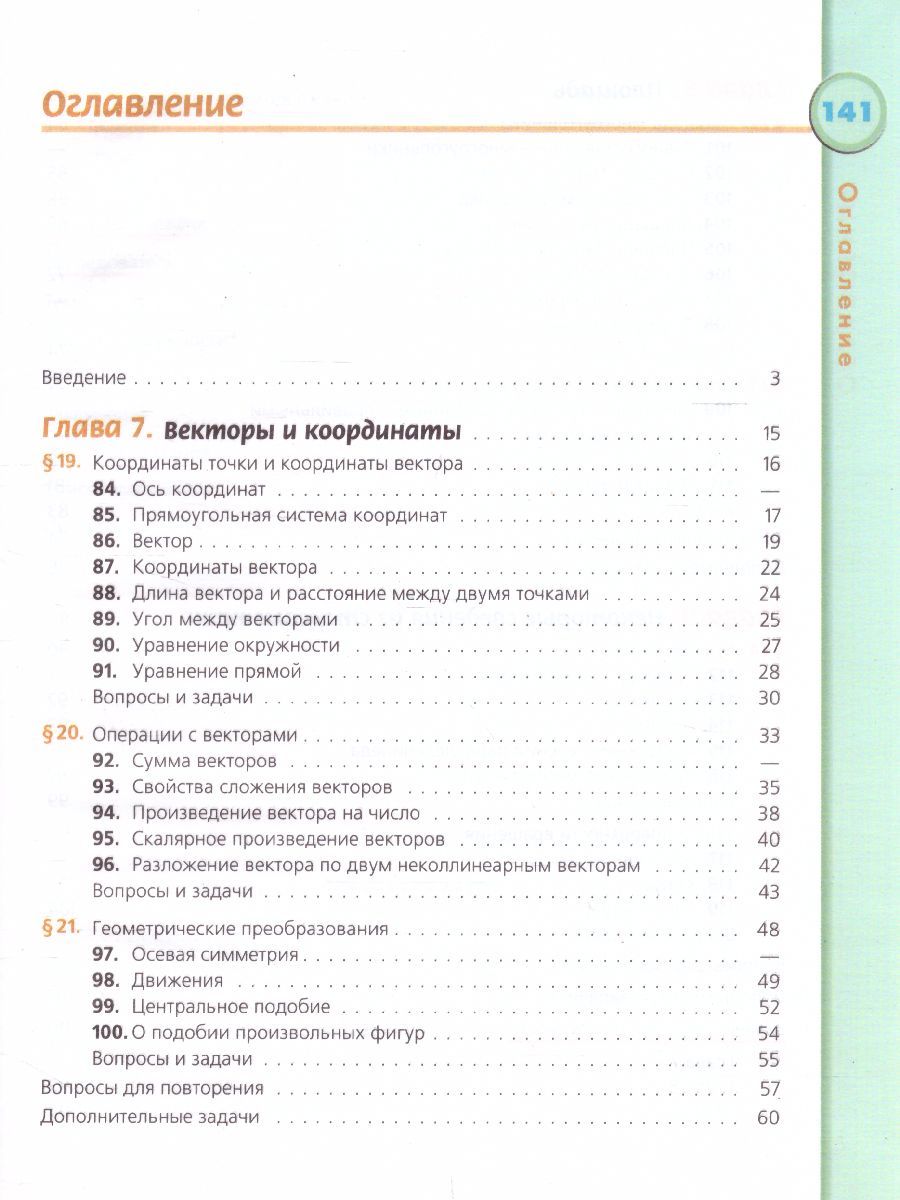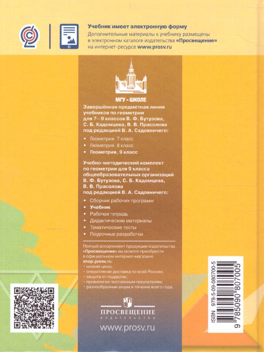 Линия УМК " Геометрия. Бутузов В.Ф. и др. (7-9)" Современный красочный учебник. Особое внимание в курсе уделяется понятию параллельности прямых, многоугольникам, в особенности четырёхугольникам и решению треугольников с помощью тригонометрического аппарата. В учебнике особое место занимают задачи с практическим содержанием, исследовательские задачи и проектные задачи и максимально используется принцип наглядности в подаче материала. УМК позвовяет обеспечить вариативность, дифференцируемость и другие принципы обучения. Дается широкая система задач (блоки задач для работы в классе и дома, дополнительные задачи к каждой главе, задачи повышенной трудности и задачи с практическим содержанием, для подготовки к ЕГЭ, что позволяет достигнуть планируемых результатов как на базовом, так и на углублённом уровнях. Исторические справки, ссылки на интернет-ресурсы позволяют учащимся готовиться к докладам, темы которых предложены в учебниках. Доказательства теорем в учебниках хорошо иллюстрированы, многие рисунки снабжены подписями, позволяющими ученику разобраться в доказательстве теоремы, даже не читая основного текста книги, а переходя от одного рисунка к другому, позволяя задействовать наглядно-образное мышление, а материал становится более доступным и понятным для учащихся. Наряду с рисунками имеются слайды, показывающие реальные прообразы тех или иных геометрических понятий. Для многих терминов объяснено их происхождение (перевод на русский язык). Учебник снабжен подробной исторической справкой, отражающей этапы развития геометрии и роль великих учёных в её становлении. Все это призвано вызвать интерес к геометрии у учащихся. Систематизация задачного материала тщательно продумана. Непосредственно после параграфов предлагаются основные задачи. В задании под определённым номером сгруппированы несколько задач и вопросов, относящихся к одной и той же теме и расположенных в порядке постепенного возрастания сложности, что позволяет учащимся оценить свои возможности, а также постепенно подготовиться к решению более сложных задач. Задания с нечётными номерами предназначены для работы в классе, а с чётными номерами — для работы дома, причём задачи для работы дома подобраны так, чтобы закрепить навыки, полученные при решении задач в классе. После каждой главы имеются дополнительные задачи, а в конце учебника — задачи повышенной трудности. Они дают возможность учителю организовать индивидуальную работу с учениками, проявляющими особый интерес к геометрии, развить и повысить этот интерес. К большинству задач даны ответы и указания.Характеристики