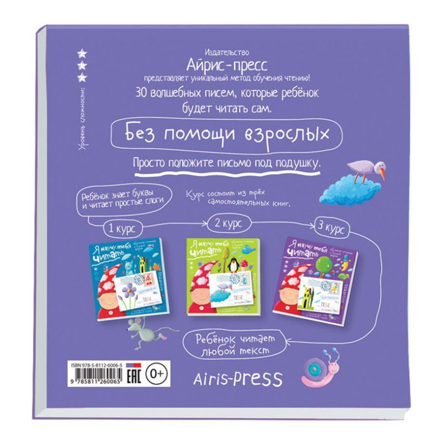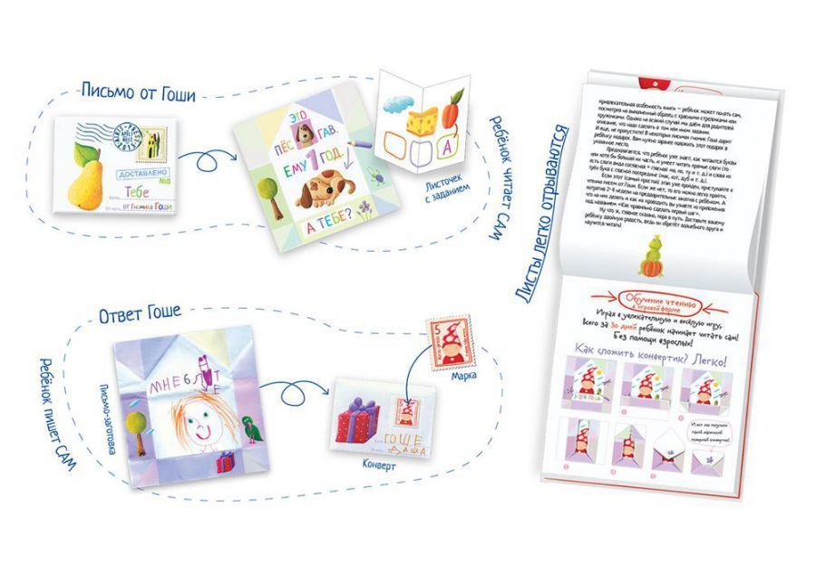 В блокноте представлен уникальный метод обучения чтению. Это 30 волшебных писем от гномика Гоши, адресованных ребёнку. Ребёнок читает их сам, без помощи взрослых. Родителям нужно просто каждый вечер незаметно класть готовое письмо под подушку спящего ребёнка. Уровень сложности рассчитан на детей, которые умеют читать сложные слова и простые предложения. При желании гномику можно написать ответ. Для этого в блокноте есть готовые письма-конверты и марки-наклейки. Также в письмо можно дополнительно вложить листочек с интересным заданием. Издание адресовано детям от 4 лет.Характеристики