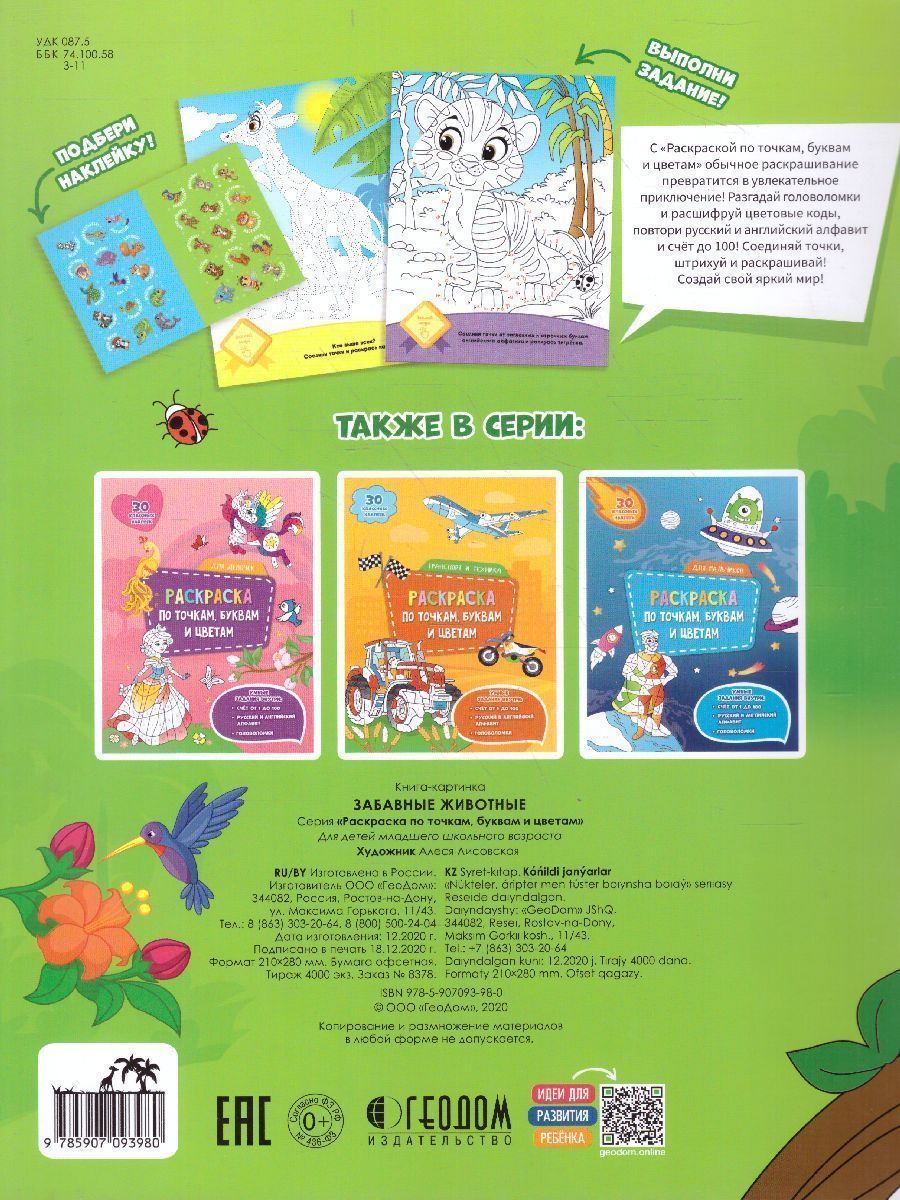 С раскраской по точкам, буквам и цветам «Забавные животные» обычное раскрашивание превратится в увлекательное приключение! Разгадай головоломки и расшифруй цветовые коды, повтори русский и английский алфавит и счёт до 100! Соединяй точки, штрихуй и раскрашивай! Красочные мотивирующие наклейки помогут оценить работу ребенка: для этого на каждой страничке с заданием есть специальное окошко. Каждый разворот- новое задание с новым героем! Создай свой яркий мир!Характеристики