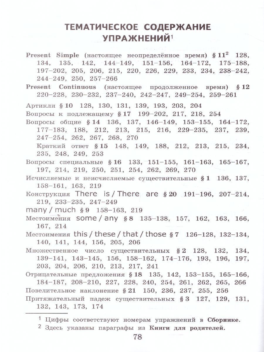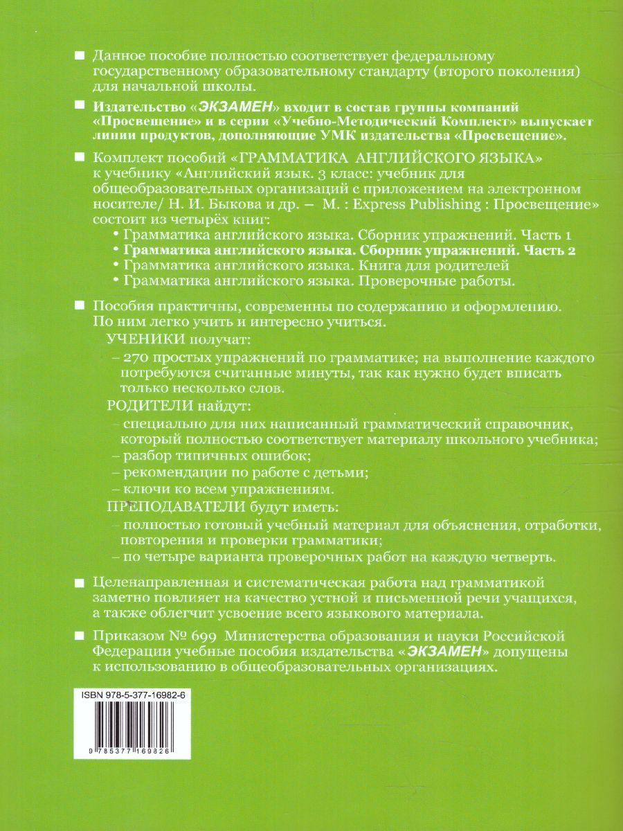 Данное пособие полностью соответствует федеральному государственному образовательному стандарту (второго поколения) для начальной школы. Оно представляет собой вторую часть учебного комплекта, состоящего из четырёх книг: -Грамматика английского языка. Сборник упражнений. Часть 1 -Грамматика английского языка. Сборник упражнений. Часть 2 -Грамматика английского языка. Книга для родителей -Грамматика английского языка. Проверочные работы. Пособие содержит 270 грамматических упражнений, обеспечивающих усвоение и закрепление правил грамматики, которые изучаются в 3 классассе. Характер упражнений позволяет выполнять их максимально быстро, что экономит силы и время учащихся и помогает в короткие сроки добиться хорошего знания грамматики. Для учащихся 3 классасса, изучающих английский язык по учебнику Н. И. Быковой и др. "Spotlight. Английский в фокусе. 3 класс. В 2-х частях".Характеристики