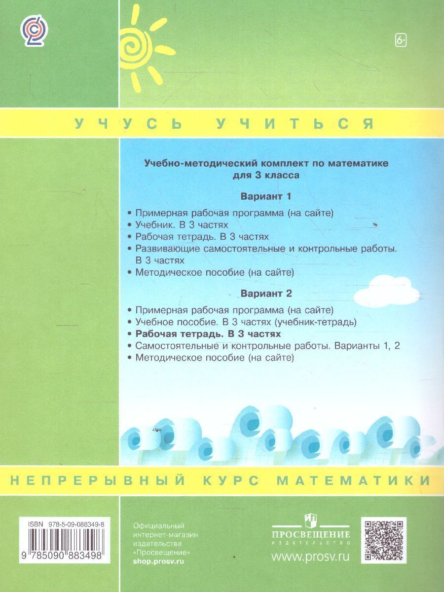 Рабочая тетрадь по математике курса «Учусь учиться» Предлагаемый курс математики для начальной школы является частью единого непрерывного курса математики для дошкольников, начальной школы и 5-9 классов средней школы, который создан в Центре системно-деятельностной педагогики «Школа 2000...» АПК и ППРО РФ с позиций реализации новых целей образования, установленных ФГОС, — достижение личностных, метапредметных и предметных результатов образования и готовности к саморазвитию на основе формирования у учащихся познавательной мотивации, универсальных учебных действий и умения учиться в целом. Он разработан на базе психолого-педагогических исследований, проведенных в 70—90-х годах в НИИ ОПП АПН СССР (В. В. Давыдов, Н. Я. Виленкин и др.), и достижений современной российской методологической школы (Г. П. Щедровицкий, О. С. Анисимов и др.). В программе курса математики «Учусь учиться» для 1—4 классов начальной школы и научно-методической литературе по программе «Школа 2000…» приведены цели и задачи курса, его общая характеристика, технологическая и дидактическая основа — дидактическая система деятельностного метода «Школа 2000…», уровни ее реализации, способ формирования универсальных учебных действий (УУД) на основе надпредметного курса «Мир деятельности», типология уроков, структура курса (содержательно-методические линии: числовая, алгебраическая, геометрическая, функциональная, логическая, линии анализа данных и текстовых задач), место курса в учебном плане и результаты его изучения (личностные, метапредметные и предметные), содержание курса для 1—4 классов.Характеристики