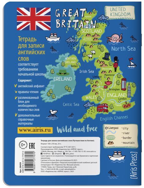 Тетрадь для записи английских слов в начальной школе "Путешествие по Англии". Тетрадь в линейку для записи английских слов в начальной школе. Прочная глянцевая ламинированная обложка с весёлым и ярким дизайном и местом для подписи. Страницы тетради разделены на три колонки: слово, транскрипция и перевод. На широких строчках удобно писать крупным детским почерком, в этой тетради поместится более 500 слов. В начале и конце есть небольшое количество справочного материала, полезного ученикам начальной школы: алфавит, правила чтения, некоторые грамматические правила, а также одна страница с основными неправильными глаголами. В конце тетради также отведено место для записи правил, которые необходимо запомнить. Тетрадь предназначена для учащихся начальных классов.Характеристики