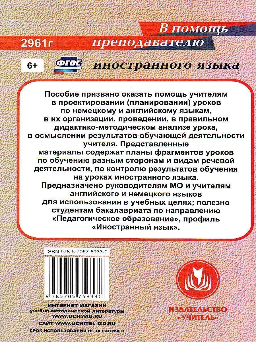 Пособие призвано оказать помощь учителям в проектировании (планировании) уроков по немецкому и английскому языкам, в их организации, проведении, в правильном дидактико-методическом анализе урока, в осмыслении результатов обучающей деятельности учителя. Представленные материалы содержат планы фрагментов уроков по обучению разным сторонам и видам речевой деятельности, по контролю результатов обучения на уроках иностранного языка. Предназначено руководителям МО и учителям английского и немецкого языков для использования в учебных целях, полезно студентам бакалавриата по направлению "Педагогическое образование", профиль "Иностранный язык".Характеристики