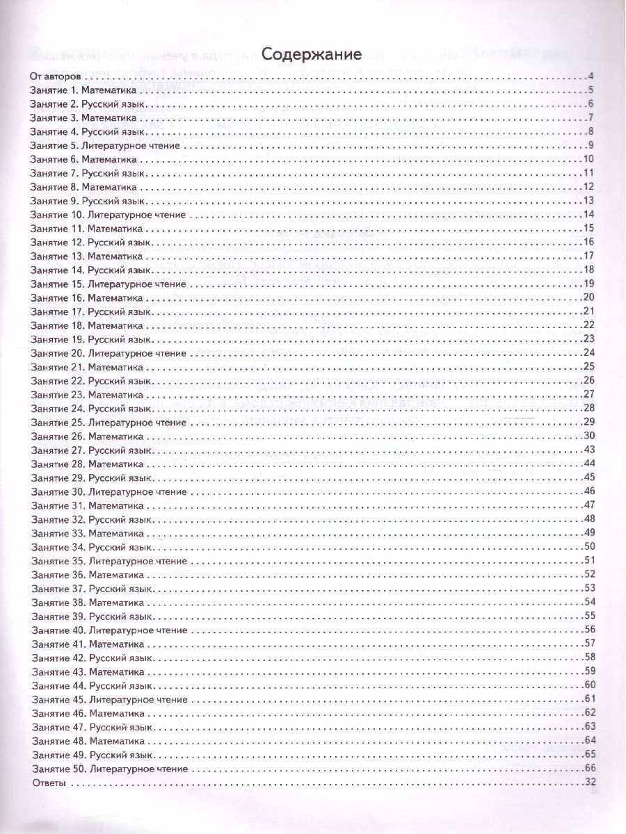 Данное пособие предназначено родителям, учителям начальной школы и классным руководителям для работы с учащимися, закончившими второй класс. Книга содержит 50 занятий с заданиями по русскому языку, литературному чтению и математике. Ответы даны в середине книги, чтобы их можно было удобно изъять. Задания составлены в соответствии с ФГОС начального общего образования. Выполняя задания нашего пособия, будущий третьеклассник получит возможность в течение летних месяцев в занимательной форме повторить основной материал и закрепить умения курса второго класса по русскому языку, литературному чтению и математике, чтобы успешно начать обучение в третьем классе.Характеристики