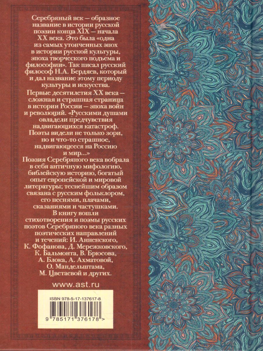 Серебряный век – образное название в истории русской поэзии конца XIX– начала ХХ века. Это была "одна из самых утончённых эпох в истории русской культуры, эпоха творческого подъёма и философии". Так писал русский философ Н.А. Бердяев, который и дал название этому периоду культуры и искусства. Первые десятилетия ХХ века – сложная и страшная страница в истории России – эпоха войн и революций. "Русскими душами овладели предчувствия надвигающихся катастроф. Поэты видели не только зори, но и что-то страшное, надвигающееся на Россию и мир…" Поэзия серебряного века вобрала в себя античную мифологию, библейскую историю, богатый опыт европейской и мировой литературы; теснейшим образом связана с русским фольклором, его песнями, плачами, сказаниями и частушками. В книгу вошли стихотворения и поэмы русских поэтов Серебряного века разных поэтических направлений и течений: И. Анненского, К. Фофанова, Д. Мережковского, К. Бальмонта, В. Брюсова, А. Блока, А. Ахматовой, О. Мандельштама, М. Цветаевой и др.Характеристики