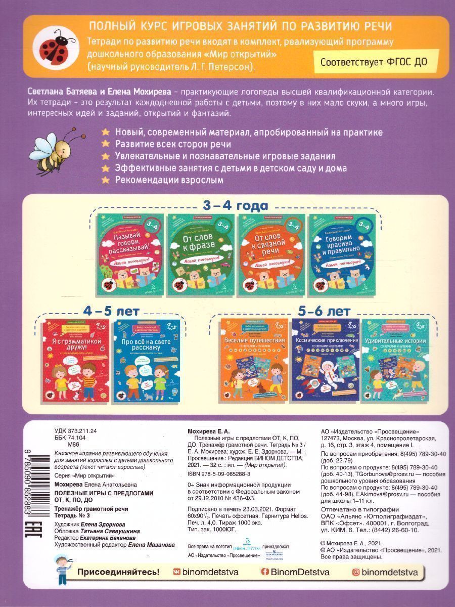 Почему так важны предлоги? Неправильное употребление предлогов приводит к ТРУДНОСТЯМ В ОВЛАДЕНИИ ПИСЬМЕННОЙ РЕЧЬЮ. Кроме того, ИСКАЖАЕТСЯ не только представление об окружающем, но и СМЫСЛ СКАЗАННОГО. Сложности в употреблении предлогов нередко вызваны недостаточным пониманием и освоением пространства, а значит, могут ОТРАЗИТЬСЯ НА ФОРМИРОВАНИИ элементарных МАТЕМАТИЧЕСКИХ ПРЕДСТАВЛЕНИЙ. Чтобы избежать подобных проблем, НАЧИНАЕМ ТРЕНИРОВАТЬСЯ! В третьей тетради комплекта с помощью упражнений-тренажеров ФОРМИРУЕМ правильный НАВЫК использования предлогов ОТ, К, ПО, ДО и переносим это умение в спонтанную речь. И все это в виде увлекательной игры с историями, веселыми заданиями, загадками и скороговорками, логическими лабиринтами и картинками-перевертышами. Е. А. Мохирева – практикующий учитель-логопед высшей квалификационной категории, автор популярных пособий по развитию речи и социальной адаптации детей. Эксперт материалов Московского городского профессионального конкурса «Педагог года Москвы-2019». Дипломант I степени «Большого Фестиваля дошкольного образования» (2020) Подготовлено 5 тренажеров по всем группам предлогов.Характеристики