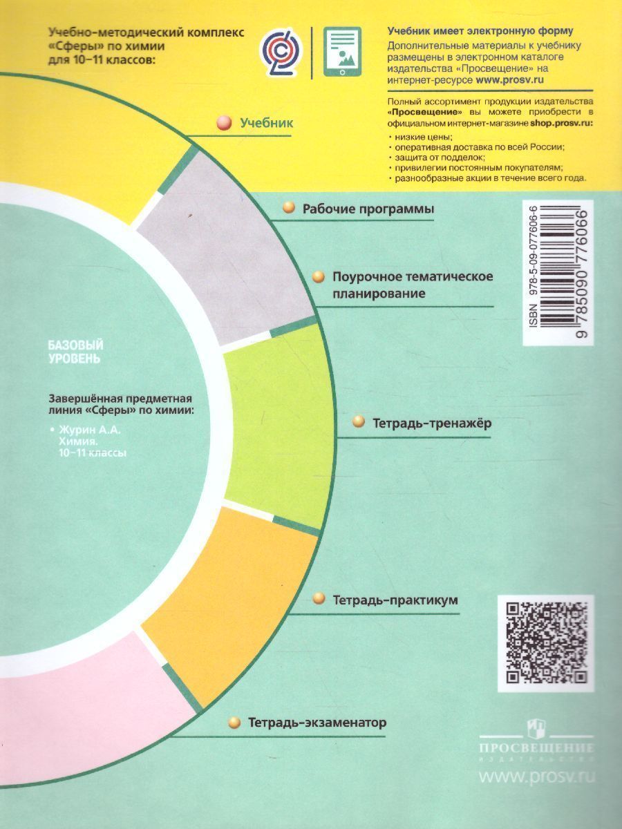 Завершённая предметная линия УМК "Сферы" по химии разработана в соответствии с требованиями ФГОС среднего общего образования. Содержание учебного материала в линии структурировано на основе следующих дидактических принципов: последовательности, доступности, межпреждметного взаимодействия, связи обучения с жизнью. Курс химии 10-11 класса рассчитан на 70 учебных часов и направлен на достижение личностных, предметных и метапредметных результатов по химии на базовом уровне. В содержание учебника вошли темы по органической химии ( углеводороды, кислородсодержащие вещества, азатсодержащие вещества) и теоретические основы химии, особое внимание уделено разделу "Химия и жизнь". Учебный материал позволяет сформировать у учащихся единую научную картину мира на основе общности понятий, законов и теорий органической и неорганической химии. Значительное место в содержании курса отводится химическому эксперименту, обучению безопасному и экологически грамотному обращению с веществами в быту и на производстве. Учебник обладает следующими отличительными особенностями, обеспечивающими его эффективность: фиксированный формат, лаконичность и жёсткая структурированность текстового материала, обширный и разнообразный иллюстративный ряд. Принципы отбора основного и дополнительного содержания связаны с преемственностью, логикой внутрипредметных и межпредметных связей, личностными особенностями учащихся. Структура и методический аппарат учебника способствуют формированию активной личности, мотивированной к самообразованию, обладающей достаточными знаниями и навыкамиХарактеристики