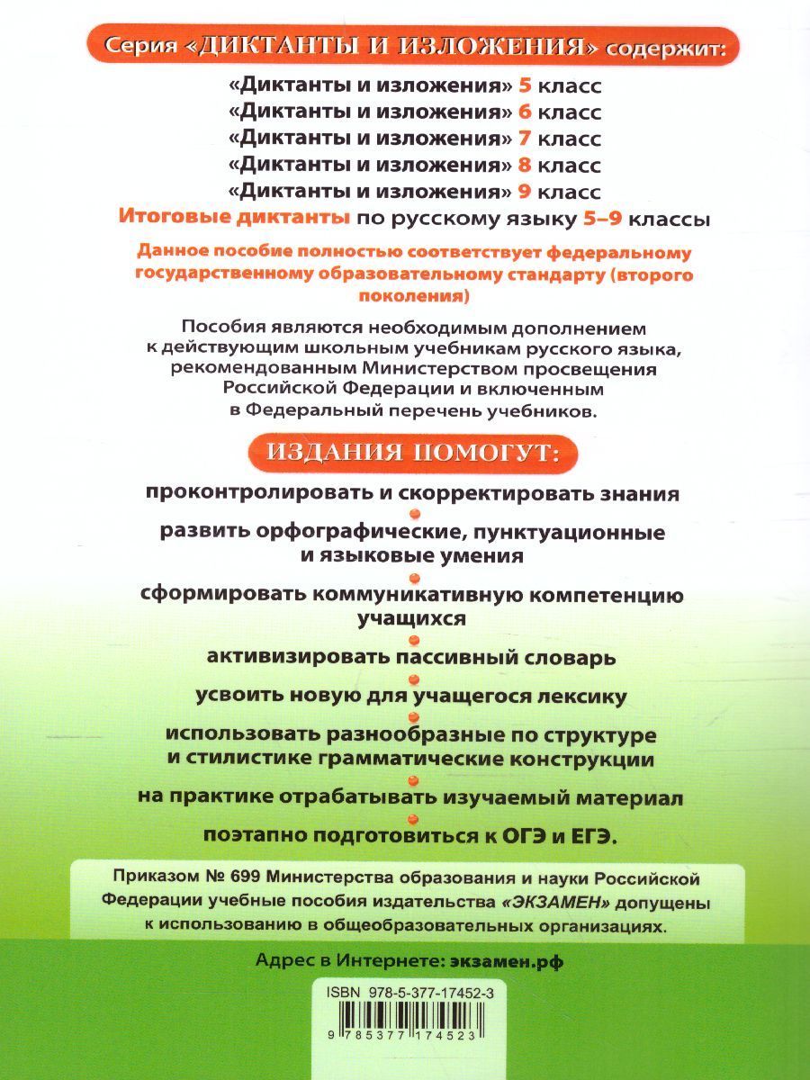 Данное пособие полностью соответствует федеральному государственному образовательному стандарту (второго поколения). Издание содержит разнообразные по видам диктанты, а также тесты для подробного, сжатого и мини-изложения по всем темам курса русского языка 5-го класса. Пособие предназначено для проверки знаний учащихся, а также развития орфографических, пунктуационных и языковых умений. В качестве текстов для диктантов и изложений предложены фрагменты произведений русской классической литературы, современных русских и зарубежных писателей, научно-популярных и публицистических статей. Пособие предназначено учителям и учащимся общеобразовательных школ.Характеристики