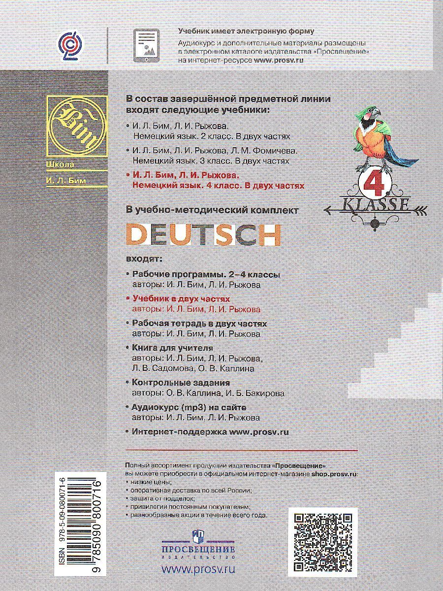 Учебно-методический комплект "Немецкий язык. 4 класс. В 2 частях. Часть 2" предназначен для учащихся 4 класса образовательных организаций. Учебник состоит из двух частей и содержит тренировочные упражнения по овладению речевыми образцами, лексикой, речевыми клише, образцами диалогов, кратких монологических высказываний. Каждую часть учебника дополняет красочно оформленное грамматическое приложение, в котором наглядно даны наиболее сложные темы немецкой грамматики. Учебник рассчитан на 2 часа в неделю и ориентирован на достижение первого уровня коммуникативной компетенции. В комплект входят: рабочая программа, учебник в двух частях, рабочая тетрадь в двух частях, книга для учителя, контрольные задания, книга для чтения, аудиокурс (mp3) к учебнику и рабочей тетради, электронная форма учебника.Характеристики