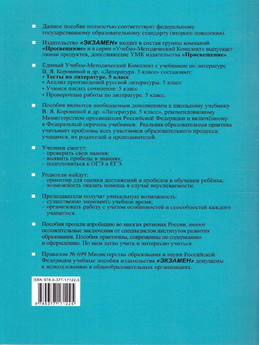 Данное пособие полностью соответствует федеральному государственному образовательному стандарту (второго поколения). Издание содержит тестовые задания к каждому художественному произведению, входящему в учебник В. Я. Коровиной и др. "Литература. 5 класс". Разработаны задания с кратким ответом, а также задания с развёрнутым ответом ограниченного объёма и подробным развёрнутым ответом на проблемный вопрос. Количество заданий определяется жанром произведения. Пособие предназначено для проведения текущего и промежуточного контроля знаний и умений учащихся 5 класса по литературе.Характеристики