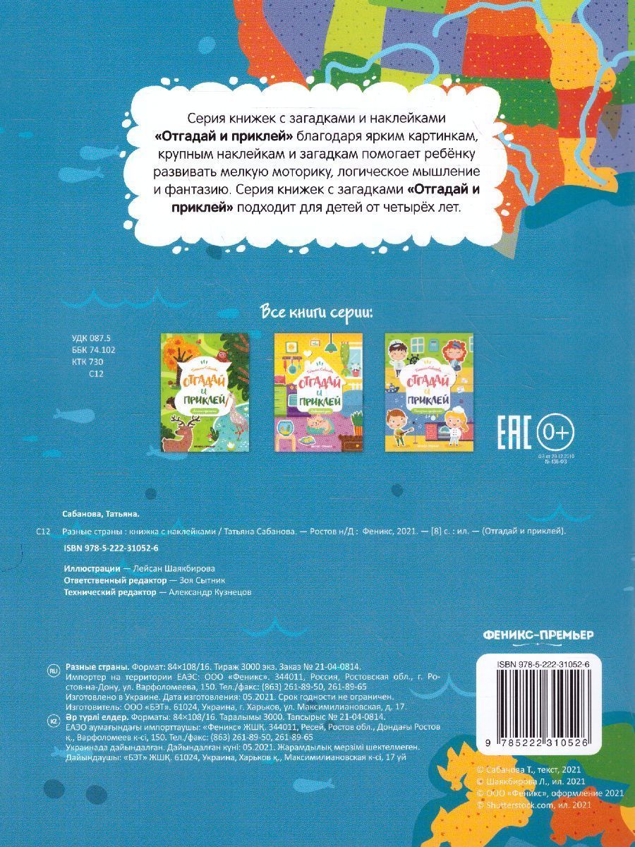 Серия книжек с загадками и наклейками «Отгадай и приклей» благодаря ярким картинкам, крупным наклейкам и загадкам помогает ребёнку развивать мелкую моторику, логическое мышление и фантазию. Серия книжек с загадками «Отгадай и приклей» подходит для детей от четырёх лет.Характеристики