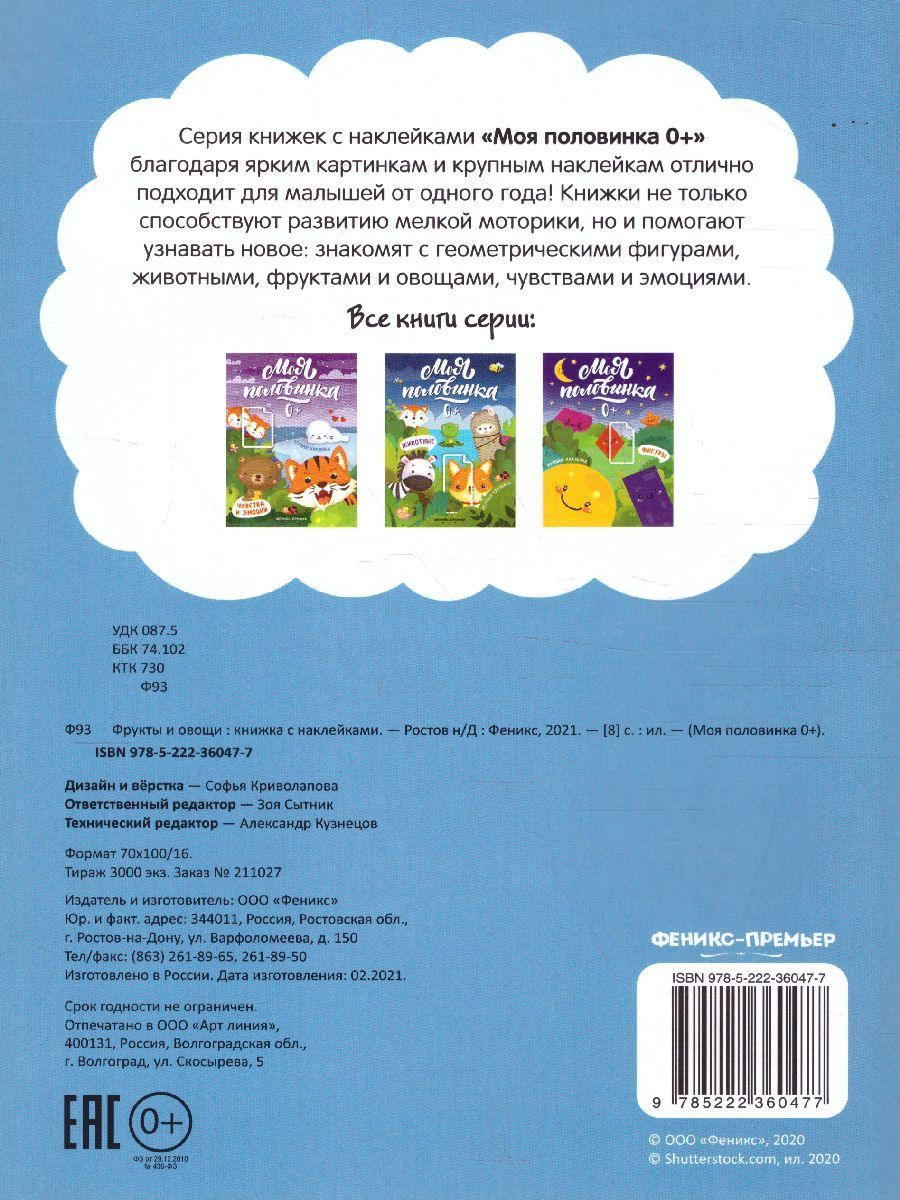 Серия книжек с наклейками «Моя половинка 0+» благодаря ярким картинкам и крупным наклейкам отлично подходит для малышей от одного года! Книжки не только способствуют развитию мелкой моторики, но и помогают узнавать новое: знакомят с геометрическими фигурами, животными, фруктами и овощами, чувствами и эмоциями.Характеристики