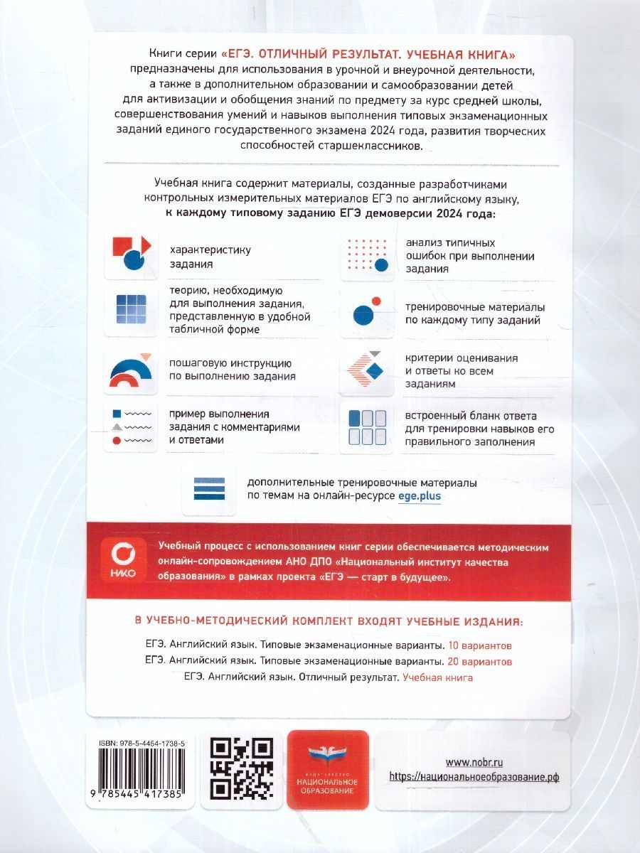 ЕГЭ-2024 Английский язык. Отличный результат. "Серия подготовлена разработчиками контрольных измерительных материалов (КИМ) единого государственного экзамена. Настоящее учебно-практическое пособие поможет выпускникам добиться оптимальных результатов на едином государственном экзамене благодаря целенаправленной активизации знаний и умений, проработке пошаговых действий, необходимых для успешного выполнения каждого типового экзаменационного задания, и отработке навыков их самостоятельного применения. По каждому из заданий экзаменационной работы в пособии предусмотрен следующий учебный и практический материал: • характеристика задания; • необходимая для выполнения задания теория, представленная в удобной табличной форме; • пошаговая инструкция по выполнению задания; • пример выполнения задания с комментариями и ответом; • анализ типичных ошибок при выполнении задания; • тренировочные материалы к каждому типу заданий: тренировочные и типовые экзаменационные задания; • критерии оценивания и ответы ко всем заданиям; • встроенный бланк ответа для тренировки навыков его правильного заполнения. Сборник также содержит типовые экзаменационные варианты для проведения входной диагностики и итогового контроля. Пособие предназначено для комплексной подготовки к государственной итоговой аттестации в форме ЕГЭ."Характеристики
