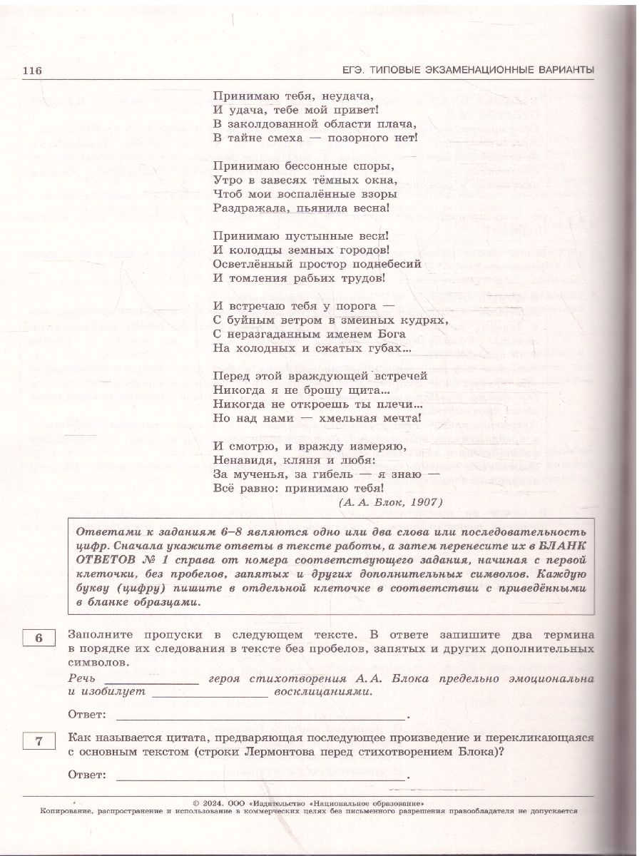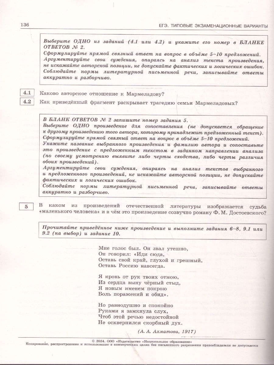 ЕГЭ 2024 Литература: 30 типовых вариантов. "Серия подготовлена разработчиками контрольных измерительных материалов (КИМ) единого государственного экзамена. В сборнике представлены: 30 типовых экзаменационных вариантов, составленных в соответствии с проектом демоверсии КИМ ЕГЭ по литературе 2024 года; инструкция по выполнению экзаменационной работы; ответы ко всем заданиям; критерии оценивания. Выполнение заданий типовых экзаменационных вариантов предоставляет обучающимся возможность самостоятельно подготовиться к государственной итоговой аттестации в форме ЕГЭ, а также объективно оценить уровень своей подготовки к экзамену. Учителя могут использовать типовые экзаменационные варианты для организации контроля результатов освоения школьниками образовательных программ среднего общего образования и интенсивной подготовки обучающихся к ЕГЭ."Характеристики