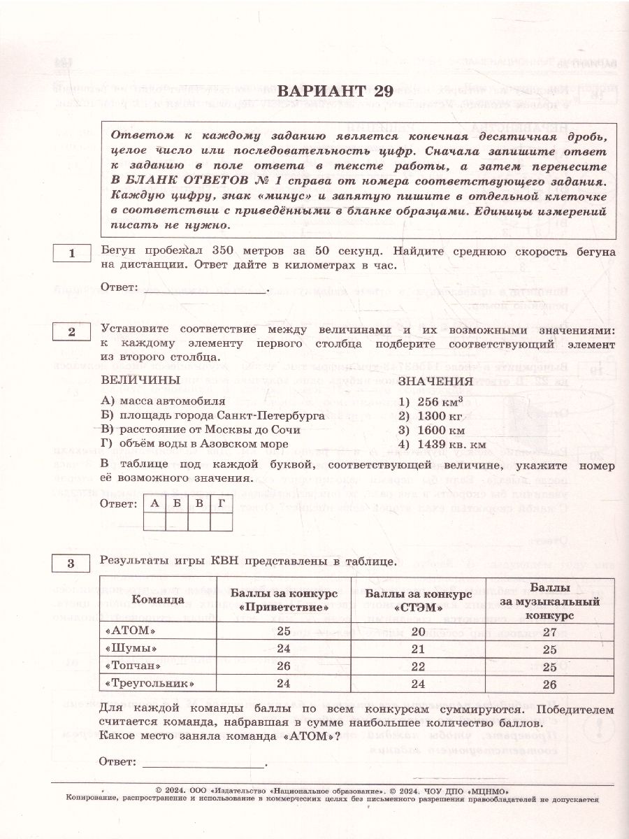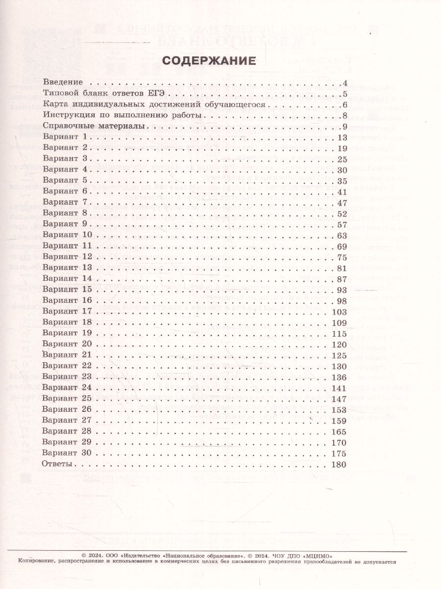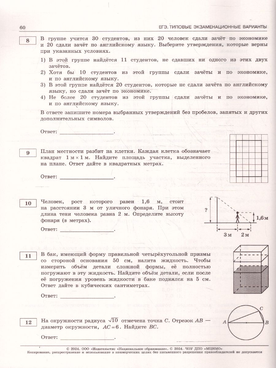 ЕГЭ-2024 Математика: типовые экзаменационные варианты: 30 вариантов. Базовый уровень. "Серия подготовлена разработчиками контрольных измерительных материалов (КИМ) единого государственного экзамена. В сборнике представлены: 30 типовых экзаменационных вариантов, составленных в соответствии с проектом демоверсии КИМ ЕГЭ по математике базового уровня 2024 года; инструкция по выполнению экзаменационной работы; ответы ко всем заданиям. Выполнение заданий типовых экзаменационных вариантов предоставляет обучающимся возможность самостоятельно подготовиться к государственной итоговой аттестации в форме ЕГЭ, а также объективно оценить уровень своей подготовки к экзамену. Учителя могут использовать типовые экзаменационные варианты для организации контроля результатов освоения школьниками образовательных программ среднего общего образования и интенсивной подготовки обучающихся к ЕГЭ."Характеристики