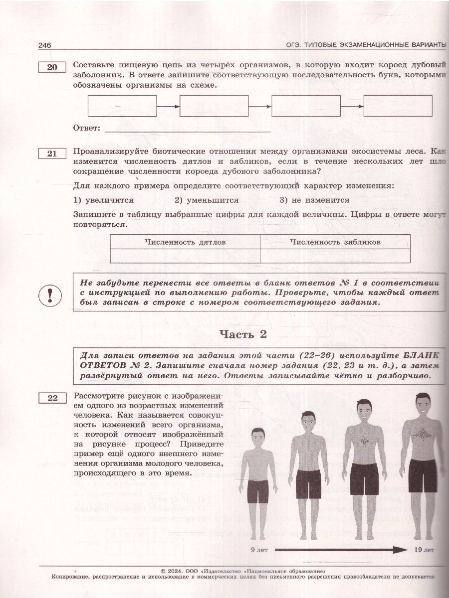 ОГЭ 2024 Биология. Типовые экзаменационные варианты: 30 вариантов. "Серия подготовлена разработчиками контрольных измерительных материалов (КИМ) основного государственного экзамена. В сборнике представлены: 30 типовых экзаменационных вариантов, составленных в соответствии с проектом демоверсии КИМ ОГЭ по биологии 2024 года; инструкция по выполнению экзаменационной работы; ответы ко всем заданиям; критерии оценивания. Выполнение заданий типовых экзаменационных вариантов предоставляет обучающимся возможность самостоятельно подготовиться к государственной итоговой аттестации в 9-м классе в форме ОГЭ, а также объективно оценить уровень своей подготовки к экзамену. Учителя могут использовать типовые экзаменационные варианты для организации контроля результатов освоения школьниками образовательных программ основного общего образования и интенсивной подготовки обучающихся к ОГЭ."Характеристики