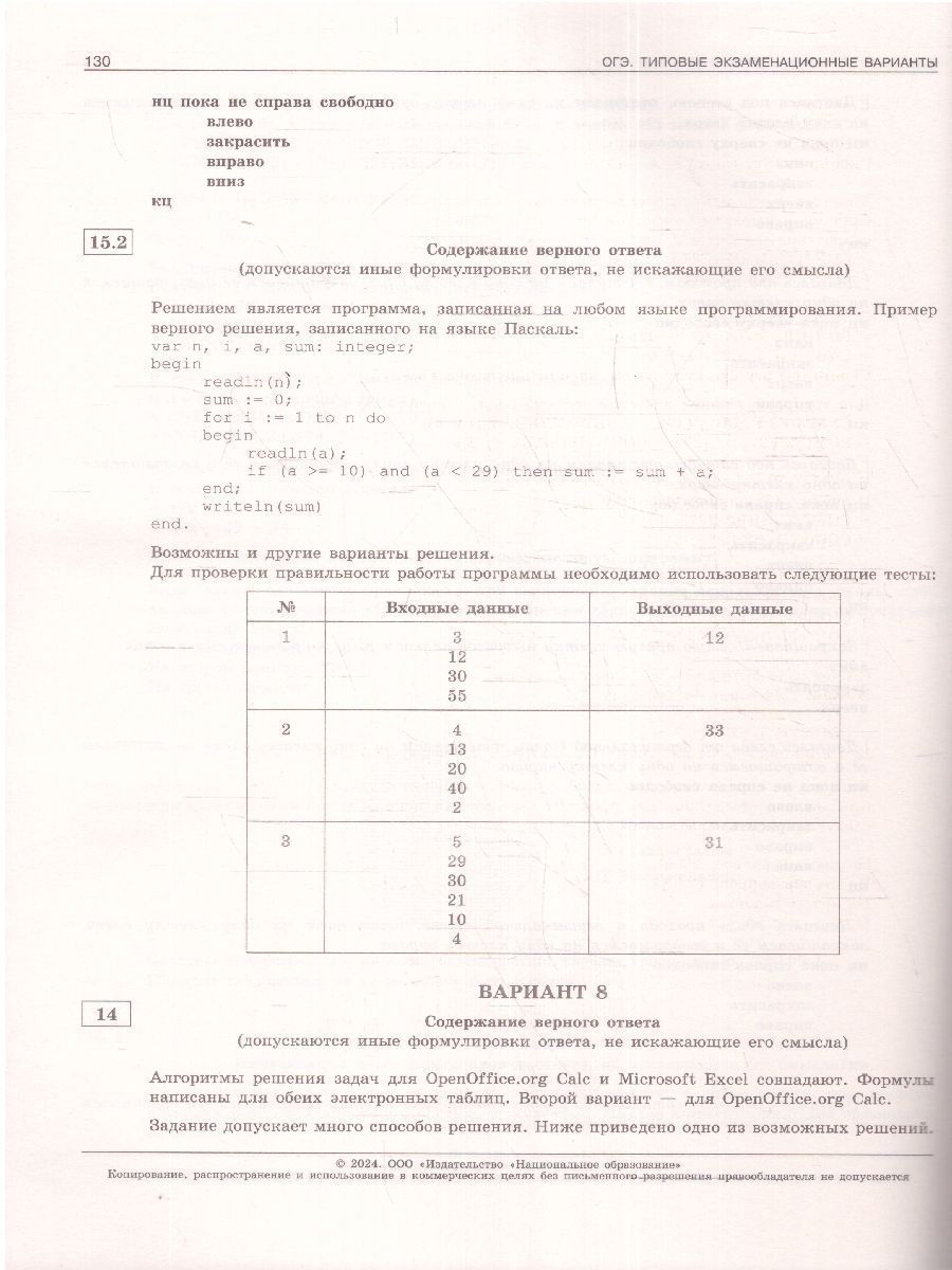 ОГЭ-2024 Информатика. Типовые экзаменационные варианты: 10 вариантов. "Серия подготовлена разработчиками контрольных измерительных материалов (КИМ) основного государственного экзамена. В сборнике представлены: 10 типовых экзаменационных вариантов, составленных в соответствии с проектом демоверсии КИМ ОГЭ по информатике 2024 года; инструкция по выполнению экзаменационной работы; ответы ко всем заданиям; критерии оценивания. Выполнение заданий типовых экзаменационных вариантов предоставляет обучающимся возможность самостоятельно подготовиться к государственной итоговой аттестации в 9-м классе в форме ОГЭ, а также объективно оценить уровень своей подготовки к экзамену. Учителя могут использовать типовые экзаменационные варианты для организации контроля результатов освоения школьниками образовательных программ основного общего образования и интенсивной подготовки обучающихся к ОГЭ."Характеристики
