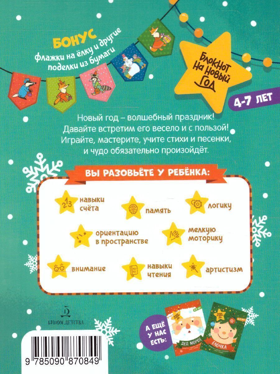 Новый год – волшебный праздник! Давайте встретим его весело и с пользой! С нашими блокнотами подготовка к Новому году и Рождеству станет для ребёнка ещё интереснее! Дети выучат стихи и песенки, смастерят новогодние поделки, украсят ёлочку, выполнят увлекательные задания. Вы можете ДЕНЬ ЗА ДНЁМ приближаться к празднику, выполняя задания постепенно. За каждое выполненное задание хвалите и поощряйте малыша. Что внутри? Стихи и песенки, задания и задачки, раскраски, ребусы и лабиринты. А ещё снежинки, шарики, флажки на ёлку и другие поделки из бумаги. Играйте, мастерите, учите стихи и песенки, и чудо обязательно произойдёт. В игре вы разовьёте у ребёнка память и артистизм, внимание и логику, навыки счета и чтения, мелкую моторику, речь и эмоциональный интеллект. Превратите занятия в радостный адвент!Характеристики