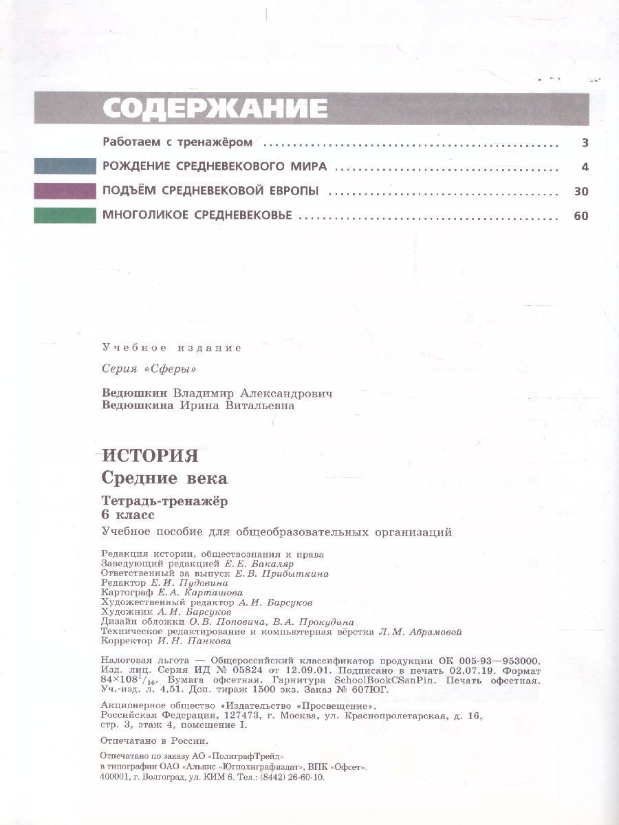 Тетрадь-тренажёр является составной частью учебно-методического комплекта «История. Средние века» для 6 класса линии УМК «Сферы». В тренажёре содержатся задания для самостоятельной работы учащихся. Главная особенность тетради заключается в том, что каждой теме курса соответствует отдельный разворот. Задания в рамках каждой темы сгруппированы по видам деятельности, соответствующим формируемым при изучении истории умениям и навыкам. Это обеспечивает возможность их отработки на разных по содержанию заданиях. Использование тетради-тренажёра ориентировано на активизацию процесса обучения и работы на результат. Этому способствует введение системы набора баллов за каждый вид работы, при котором выставление оценки не является обязательным.Характеристики
