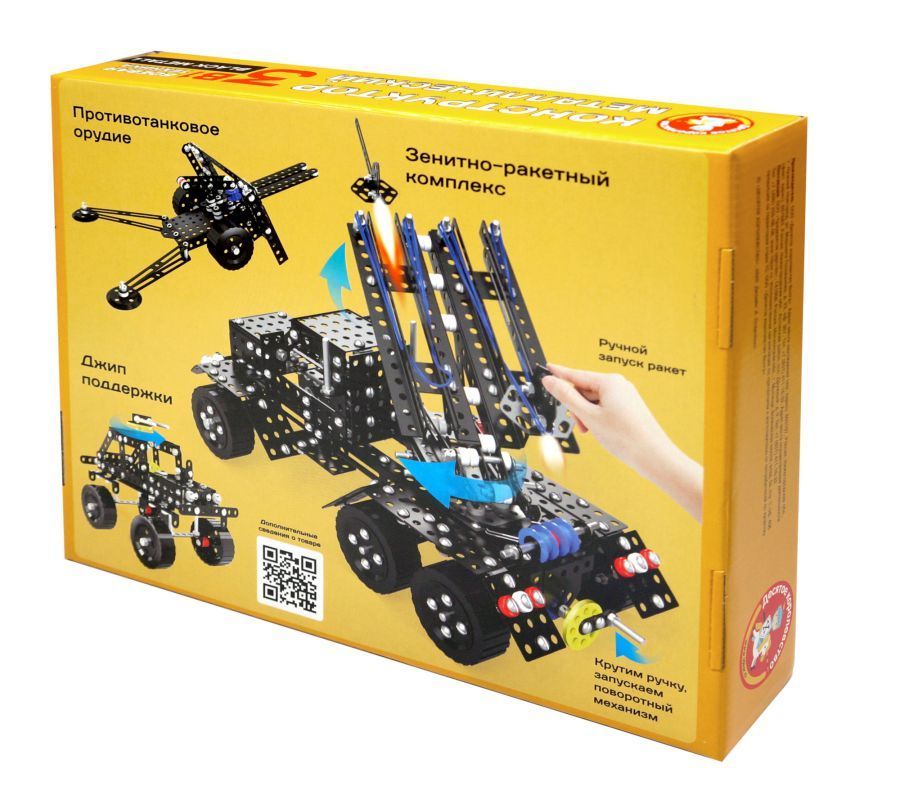 Соберите целый боевой комплекс с металлическим конструктором «Боевая техника». Из комплектующих набора можно собрать: - зенитно-ракетный комплекс (зенитные ракеты 2 штуки); - противотанковое орудие; - джип поддержки. Состав набора (всего 720 элементов): диск малый чёрный (6 штук), диск большой чёрный (2 штуки), уголок 1 с круглыми отверстиями (чёрный, 13 штук), уголок 2 треугольной формы (чёрный, 10 штук), уголок 3 длинный (чёрный, 10 штук), планка с 2 отверстиями (чёрная, 8 штук), планка с 3 отверстиями (чёрная, 3 штуки), планка с 5 отверстиями (чёрная, 7 штук), планка с 7 отверстиями (чёрная, 7 штук), планка с 9 отверстиями (чёрная, 2 штуки), планка с 15 отверстиями (чёрная, 5 штук), планка с круглыми и овальными отверстиями (чёрная, 8 штук), косынка с 1 скошенным углом (чёрная, 4 штуки), косынка с 4 отверстиями (чёрная, 2 штуки), косынка с 7 отверстиями (чёрная, 9 штук), скоба с 5 отверстиями (4 штуки), скоба с 7 отверстиями (10 штук), скоба малая (4 штуки), скоба большая, пластина (20х40 см, 13 штук), пластина (20х50 см, 28 штук), панель большая (чёрная), панель малая (чёрная, 2 штуки), шкив (5 штук), план-шайба (2 штуки), втулка красная (8 штук), втулка чёрная (22 штуки), втулка белая (30 штук), гайка М4 (250 штук), винт М4х6 (145 штук), винт М4х8 – (44 штуки), винт М4х16 (18 штук), винт М4х20 (7 штук), винт М4х35 (11 штук), шпилька 75 мм (4 штуки), резинка (5 штук), ось 140 мм (2 штуки), колёса из пластика (6 штук, 5 см), отвёртка, гаечный ключ, инструкция.Характеристики