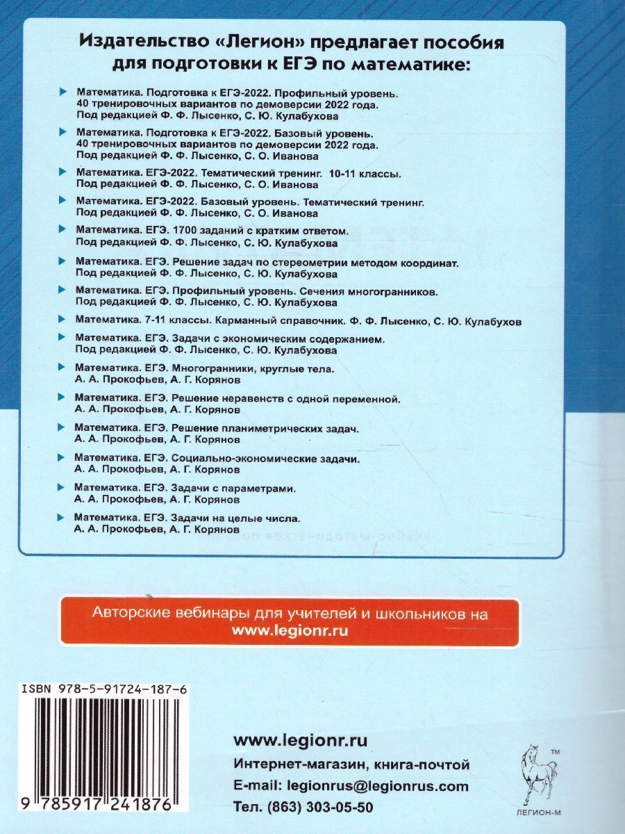Пособие "Математика. ЕГЭ 2022. Тематический тренинг" предназначено для подготовки к единому государственному экзамену по математике базового и профильного уровней, а также для отработки материала, который изучается на уроках. Оно будет полезно учащимся выпускных классов, учителям и тем, кто собирается сдавать экзамен после перерыва в обучении. Материал пособия сгруппирован по 30 темам, охватывающим все разделы элементов содержания, проверяемые на ЕГЭ, в том числе задания с развёрнутым ответом. В книге содержатся: - краткие теоретические сведения с примерами решения; - более 1600 заданий в формате ЕГЭ (ко многим из них приведено подробное решение); - тренировочные варианты для контроля; каждый вариант содержит 5 заданий, которые отражают различные аспекты рассматриваемой темы; - ответы ко всем заданиям. В новое издание добавлен параграф «Графики функций на клетчатой бумаге», а также усилен блок задач по теории вероятностей, согласно перспективной модели ЕГЭ профильного уровня. В частности, добавлен параграф об использовании комбинаторных формул в теории вероятностей и понятии условной вероятности. Пособие удобно использовать и при дистанционном обучении.Характеристики