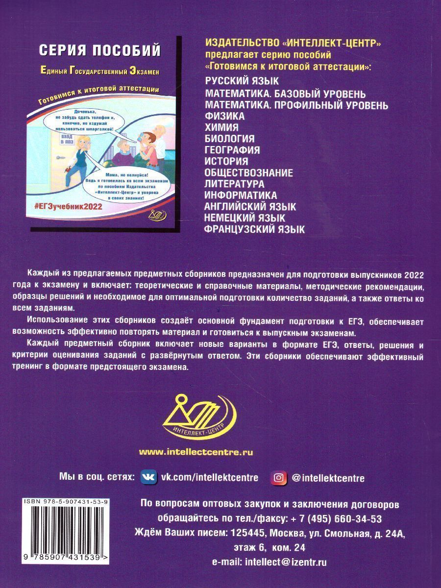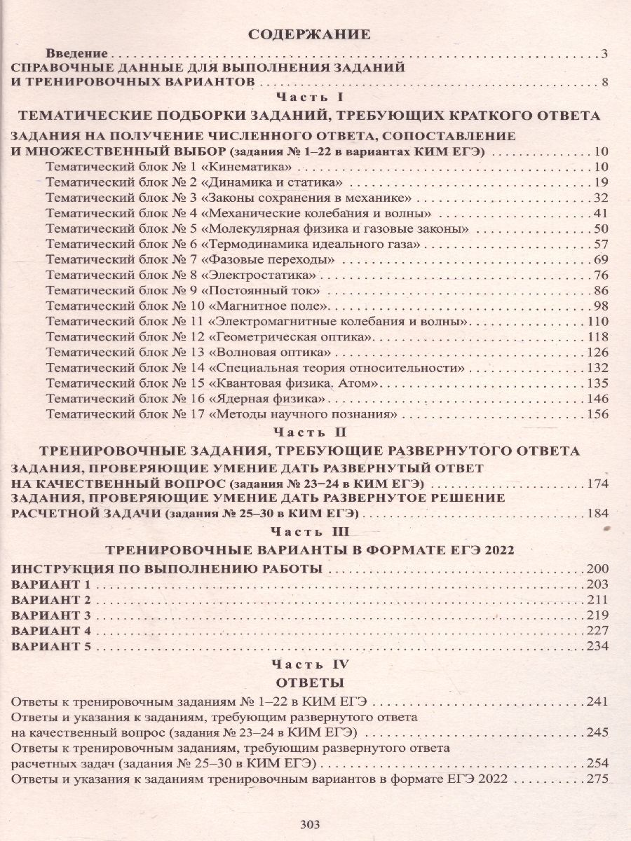 Данное пособие предназначено для подготовки учащихся 10-11-х классов к Единому государственному экзамену (ЕГЭ) по физике. Издание включает типовые задания по всем содержательным линиям экзаменационной работы, а также примерные варианты в формате ЕГЭ 2022 года. Пособие поможет школьникам проверить свои знания и умения по предмету, а учителям - оценить степень достижения требований образовательных стандартов отдельными учащимися и обеспечить их целенаправленную подготовку к экзамену. Пособие может быть также использовано учителями как сборник заданий в формате ЕГЭ при системном изучении курса физики в 10-11-х классах.Характеристики