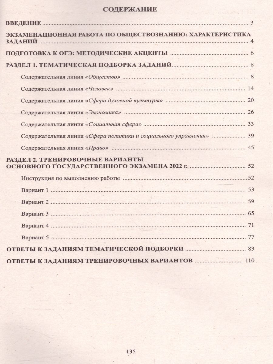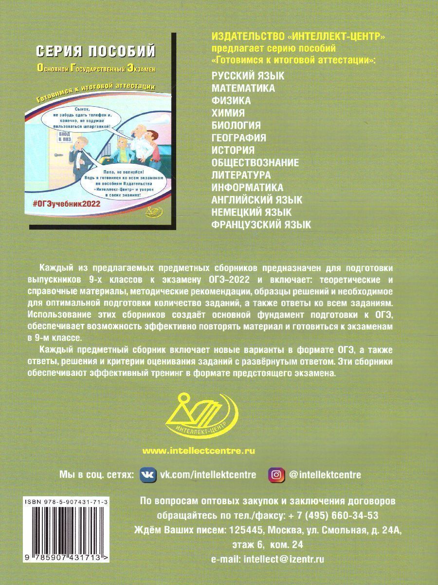 Данное пособие предназначено для подготовки учащихся 9 классов к государственной аттестации - основному государственному экзамену (ОГЭ) по обществознанию. Издание включает типовые задания по всем содержательным линиям экзаменационной работы, а также примерные варианты в формате ОГЭ 2022 года. Пособие поможет школьникам проверить свои знания и умения по предмету, а учителям - оценить степень достижения требований образовательных стандартов отдельными учащимися и обеспечить их целенаправленную подготовку к экзамену.Характеристики