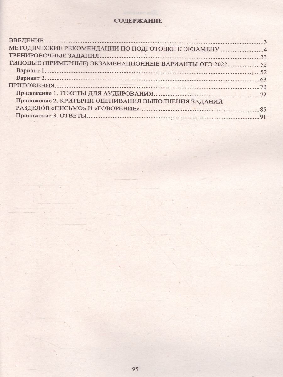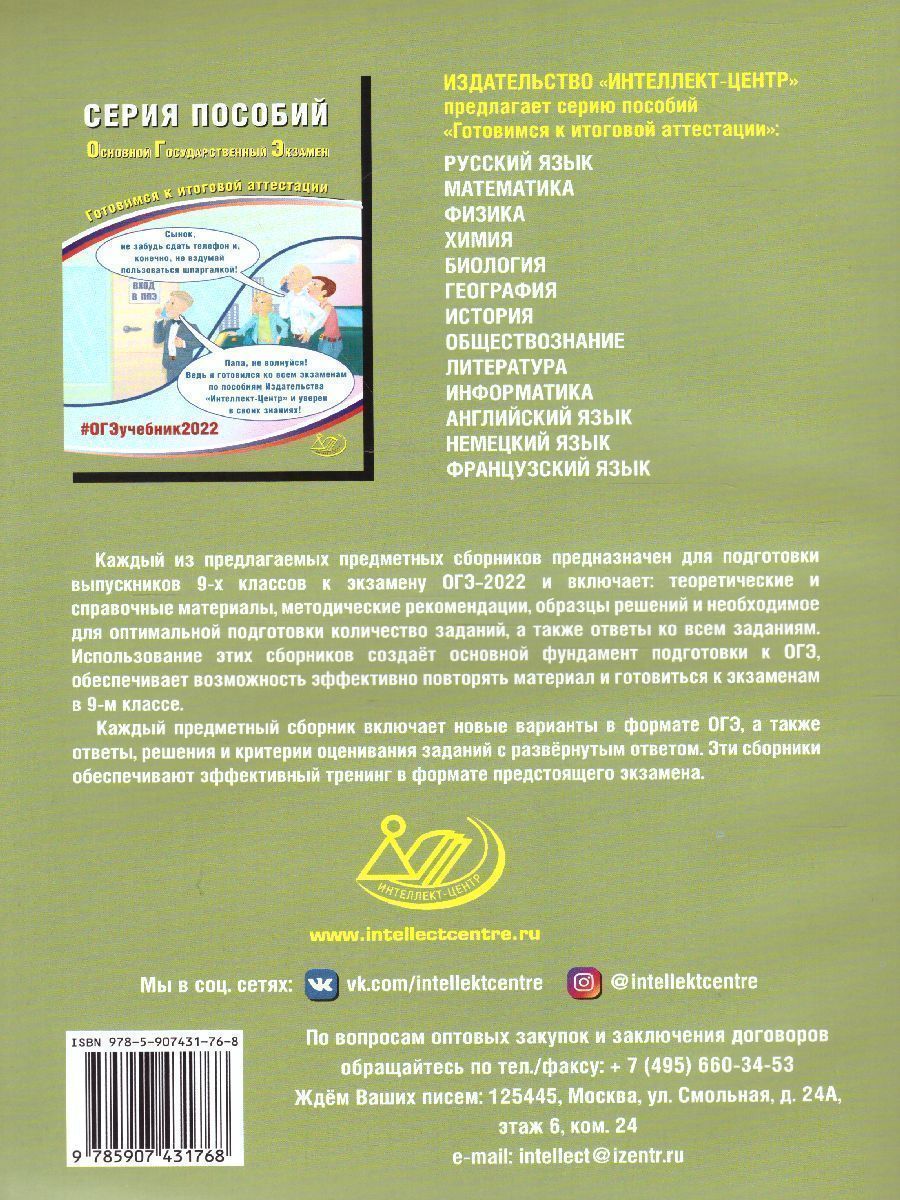 Данное пособие предназначено для подготовки учащихся 9 классов к Основному государственному экзамену (ОГЭ) по французскому языку. Издание содержит типовые задания по всем содержательным аспектам экзаменационной работы, примерные варианты в формате ОГЭ 2022 года, а также методические рекомендации по их выполнению. Пособие поможет школьникам проверить свои знания и умения по предмету, а учителям - оценить уровень знаний учащихся и организовать целенаправленную подготовку к экзаменам. Материалы к разделу "Аудирование" представлены на сайте издательства Интеллект-Центр.Характеристики