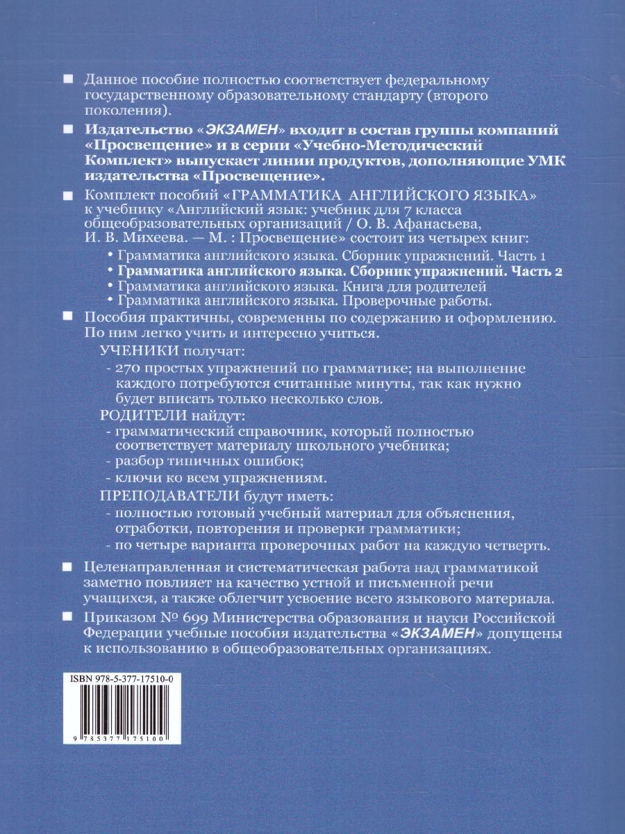 Данное пособие полностью соответствует федеральному государственному образовательному стандарту (второго поколения). Оно представляет собой вторую часть учебного комплекта, состоящего из четырёх книг: -Грамматика английского языка. Сборник упражнений. Часть 1 -Грамматика английского языка. Сборник упражнений. Часть 2 -Грамматика английского языка. Книга для родителей -Грамматика английского языка. Проверочные работы. Сборник содержит 270 грамматических упражнений, обеспечивающих усвоение и закрепление правил грамматики, которые изучаются в 7 классассе. Характер упражнений позволяет выполнять их максимально быстро, что экономит силы и время учащихся и помогает в короткие сроки добиться хорошего знания грамматики. Для учащихся школ с углублённым изучением английского языка, лицеев, гимназий, колледжей, изучающих язык по учебнику О. В. Афанасьевой, И. В. Михеевой "Английский язык: 7 классасс".Характеристики