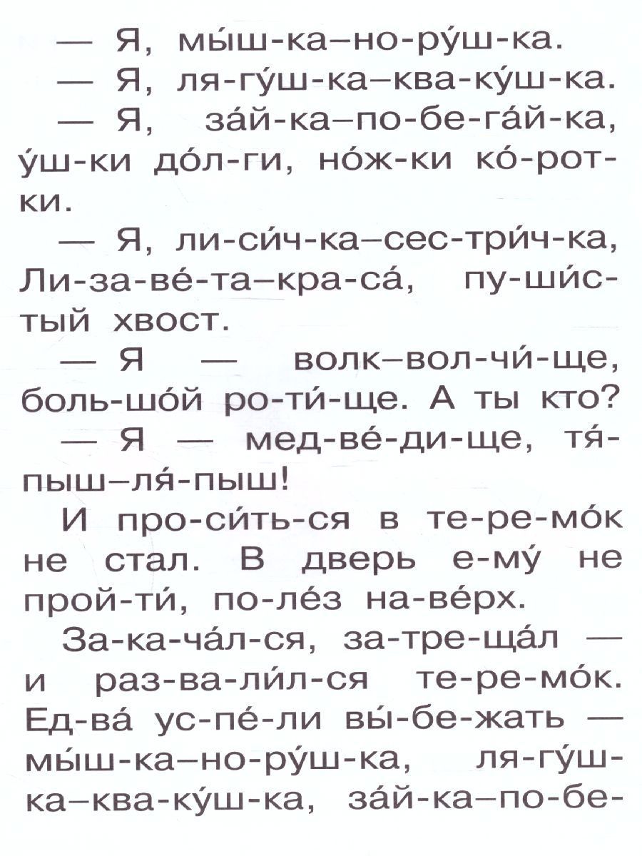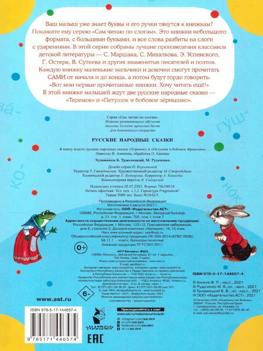 Ваш малыш уже знает буквы и его ручки тянутся к книжкам? Покажите ему серию "Сам читаю по слогам". Это книжки небольшого формата, с большими буквами, и все слова разбиты на слоги с ударениями. В этой серии собраны лучшие произведения классиков детской литературы — С. Маршака, С. Михалкова, Э. Успенского, Г. Остера, В. Сутеева и других знаменитых писателей и поэтов. Каждую книжку маленькие мальчики и девочки смогут прочитать САМИ от начала и до конца, а потом будут гордо говорить: "Вот мои первые прочитанные книжки. Хочу читать ещё!" В этой книжке малышей ждут две русские народные сказки — "Теремок" и "Петушок и бобовое зёрнышко". Для дошкольного возраста.Характеристики