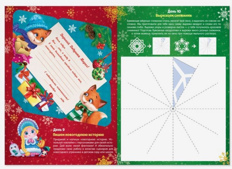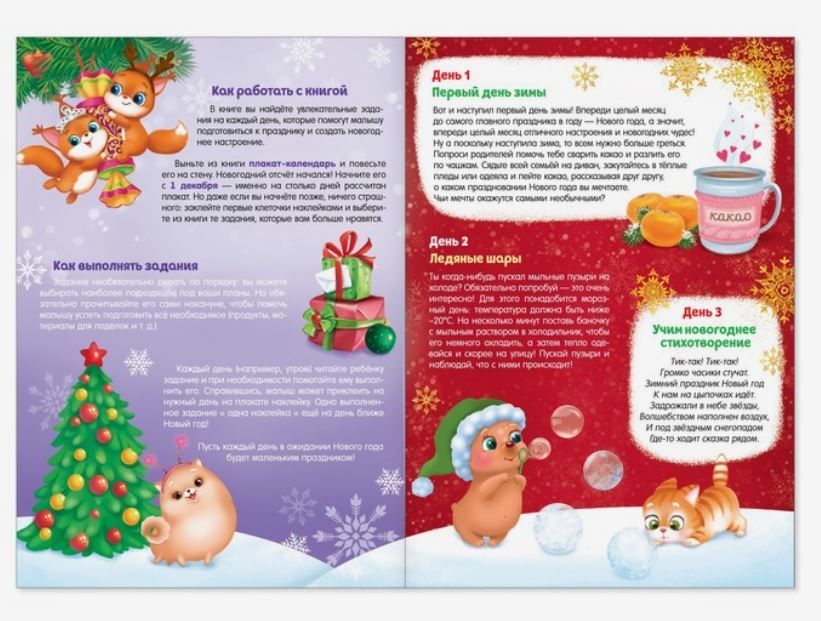 С книжкой с наклейками "Адвент- календарь" ребёнок успеет подготовиться к главному зимнему празднику и зарядится отличным настроением. В течение всего декабря малыш будет выполнять задания и отмечать даты в календаре с помощью наклеек. Ребёнок напишет письмо Деду Морозу, раскрасит картинки, расшифрует слова, преодолеет лабиринты.Характеристики