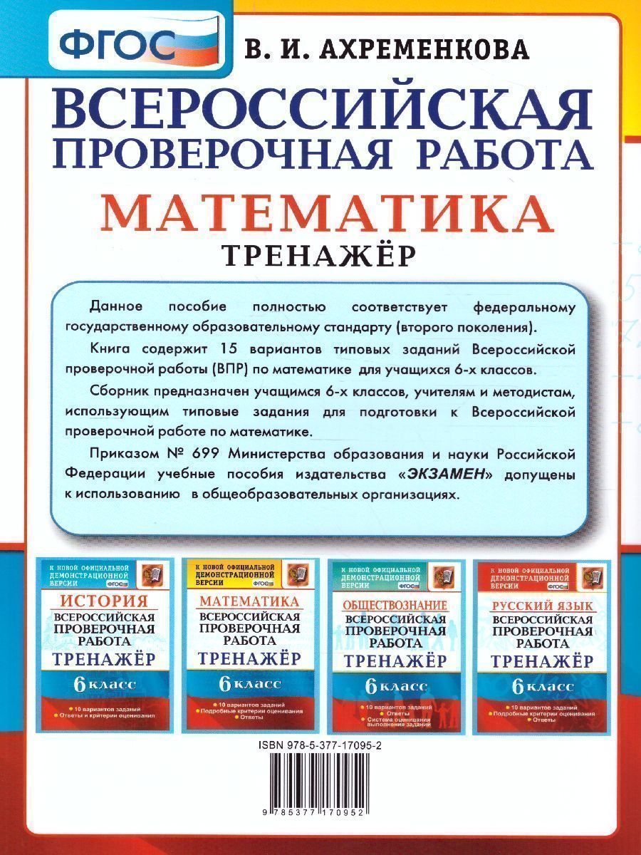 Данное пособие полностью соответствует федеральному государственному образовательному стандарту (второго поколения). Книга содержит 15 вариантов типовых заданий Всероссийской проверочной работы (ВПР) по математике для учащихся 6-х классассов. Сборник предназначен учащимся 6-х классассов, учителям и методистам, использующим типовые задания для подготовки к Всероссийской проверочной работе по математике.Характеристики