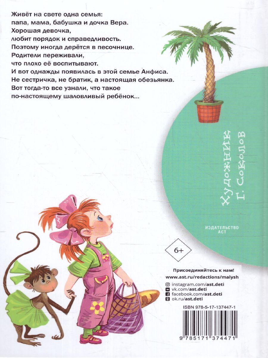 В книгу вошли шесть классических историй про девочку Веру и обезьянку Анфису. Однажды в семье педагогов появляется настоящая, живая обезьянка. Дочке Вере это, конечно, очень нравится – её скучная дошкольная жизнь в детском саду и дома тут же превращается в череду приключений. Но при этом девочка понимает: она теперь старшая и отвечает за поведение своей озорной подружки. Для младшего школьного возраста.Характеристики
