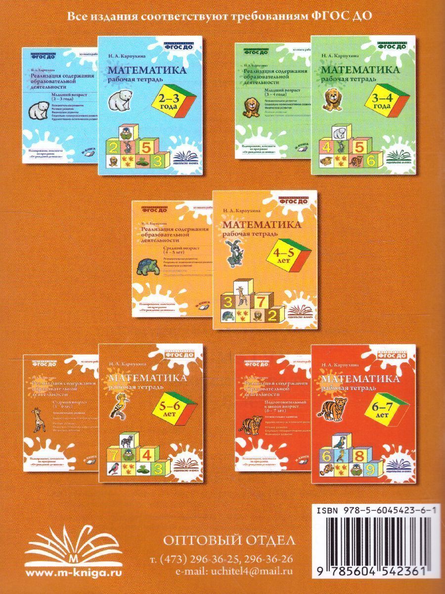 Серия рабочих тетрадей по математике является приложением к практическому пособию «Реализация содержания образовательной деятельности» образовательной области Познавательное развитие (ФЭМП) в работе с детьми соответствующего возраста. Выполняя практические задания, дети совершенствуют свои знания в изучении окружающего мира через пространственные, временные и количественные отношения, его величину и форму, систематизируют познания и умения в области логических размышлений и решений элементарных арифметических задач. Задания в тетрадях составлены по принципу расширения и усложнения от возрастной группы (2-3 лет) до возрастной группы (6-7 лет). Структура тетради, начиная с возраста от 3 до 4 лет и старше, имеет обязательным элементом счет (в разных его вариациях) в соответствии с возрастными возможностями ребенка и работу в клетке простой тетради (рисование, обводка, печатание геометрических фигур, линий).Тетрадь рассчитана на совместную работу взрослых и детей. Она предназначена для работы в детских дошкольных учреждениях, но может быть использована как самостоятельные мини-игры с одним ребёнком (например, дома с мамой или с психологом в детском саду) или подгруппой детей.Характеристики