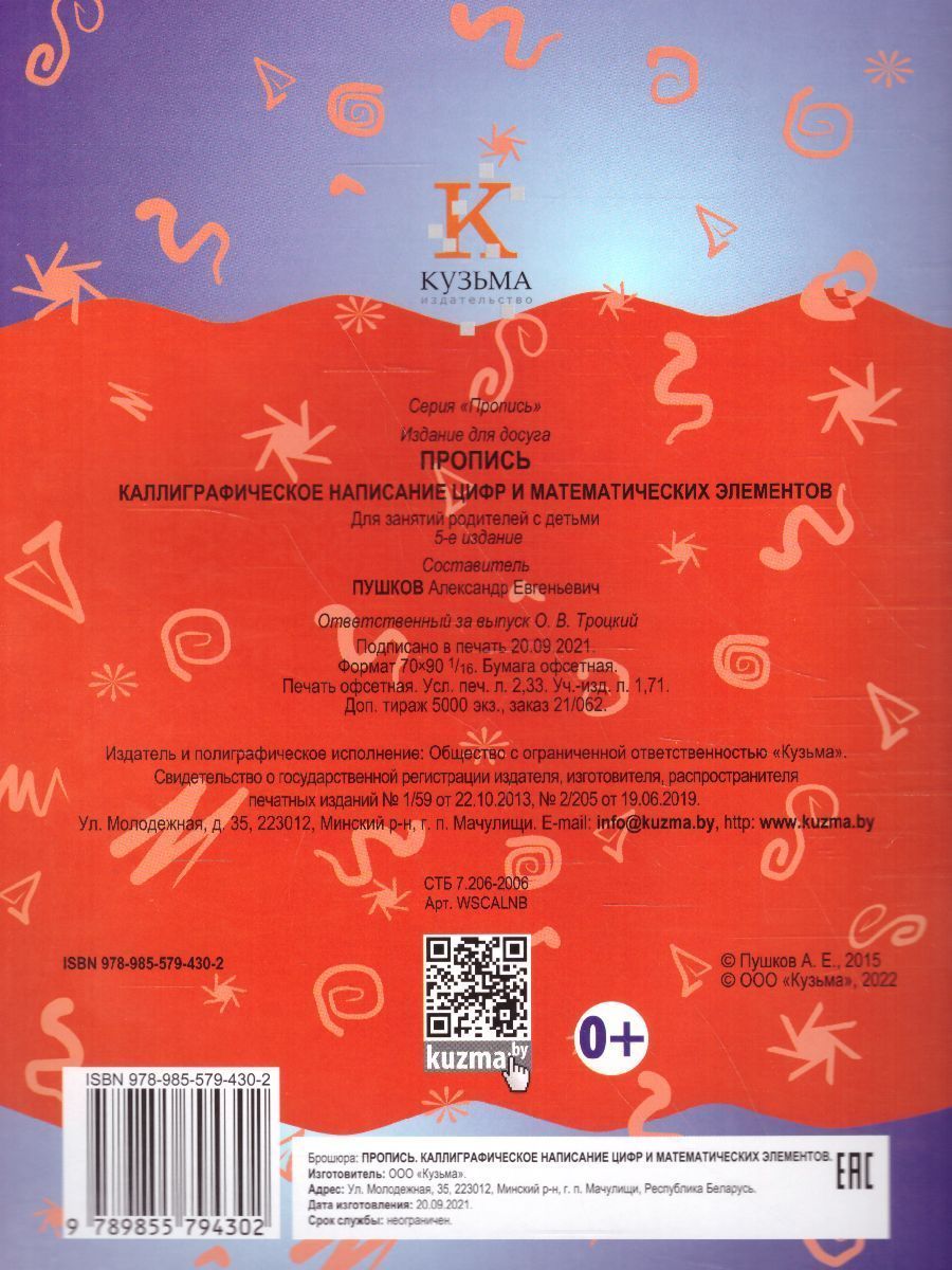 Прописи для детей дошкольного и младшего школьного возраста. Вместе с этой тетрадью ребенок научиться правильно и красиво писать цифры и математические элементы. Составитель: Пушков Александр Евгеньевич. 5-е изданиеХарактеристики