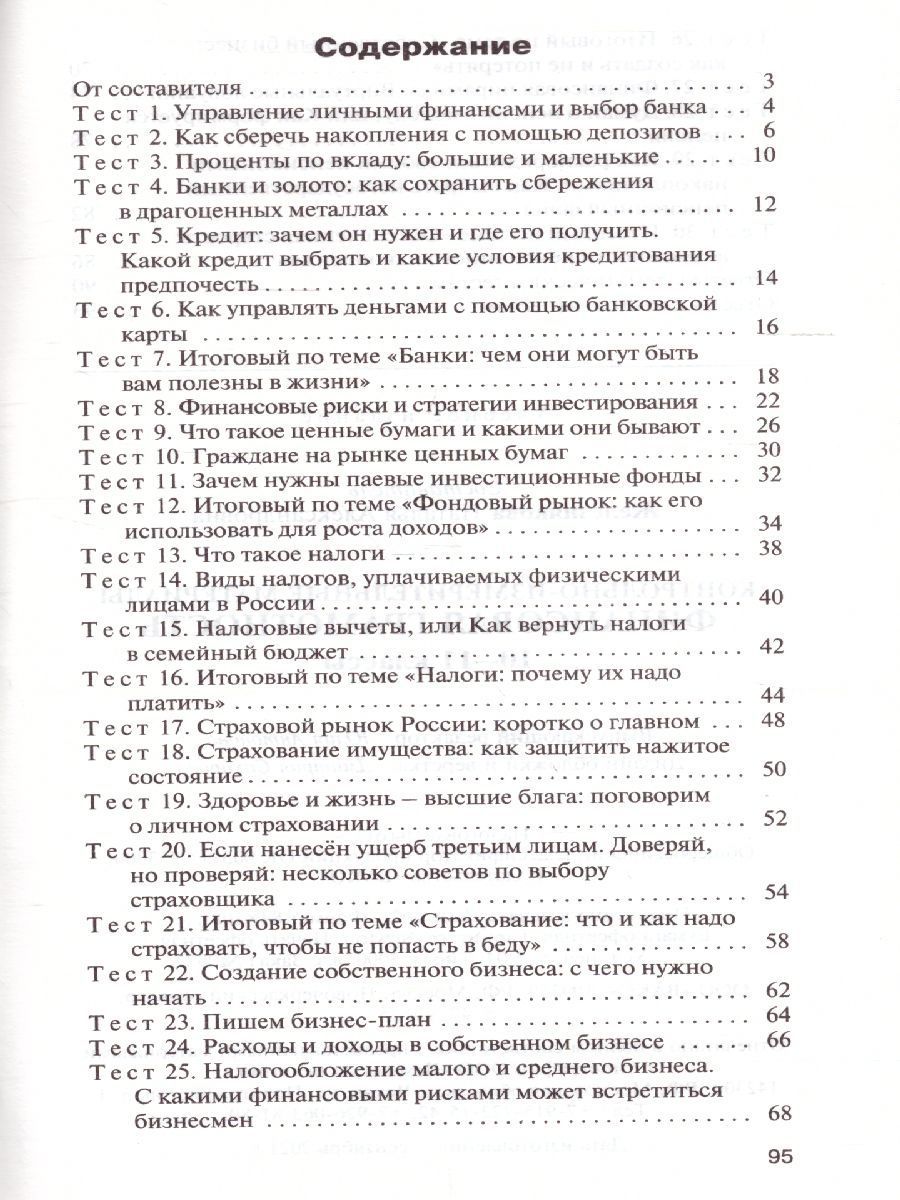 В пособии представлены контрольно-измерительные материалы по финансовой грамотности для 10-11 классов. Они содержат разнообразные задания для текущего и итогового контроля по изучаемому курсу. Материал расположен в соответствии с порядком изложения тем в учебнике "Финансовая грамотность. 10-11 классы" Ю.В. Бреховой, А.П. Алмосова, Д.Ю. Завьялова (М.: ВАКО). В конце пособия даны ответы ко всем тестам. Издание адресовано учителям, школьникам и их родителям. Составитель Железнякова Н.А.Характеристики