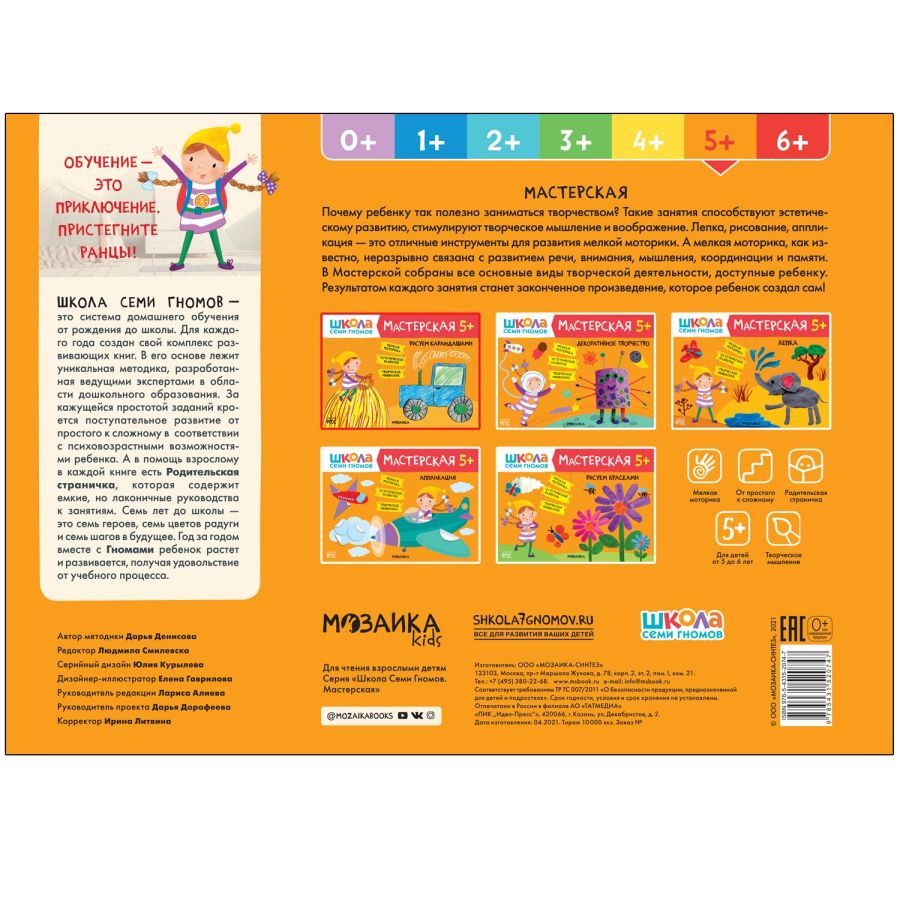 Книга «Рисуем карандашами 5+» из серии «Школа Семи Гномов. Мастерская» — это красочный альбом для занятий рисованием с ребенком от 5 до 6 лет. Занятия на близкие и понятные ребенку темы расположены по мере усложнения: поступательно переходя от освоения простых навыков к более сложным заданиям, ребенок научится создавать рисунки с помощью карандашей или фломастеров. Результатом каждого занятия станет законченное произведение, которое ребенок создал сам. В конце альбома юного художника ждет большое итоговое задание, где он сможет применить все свои новые умения. Подходящий уровень сложности и полученное удовольствие от занятий — вот залог успешного обучения по системе.Характеристики
