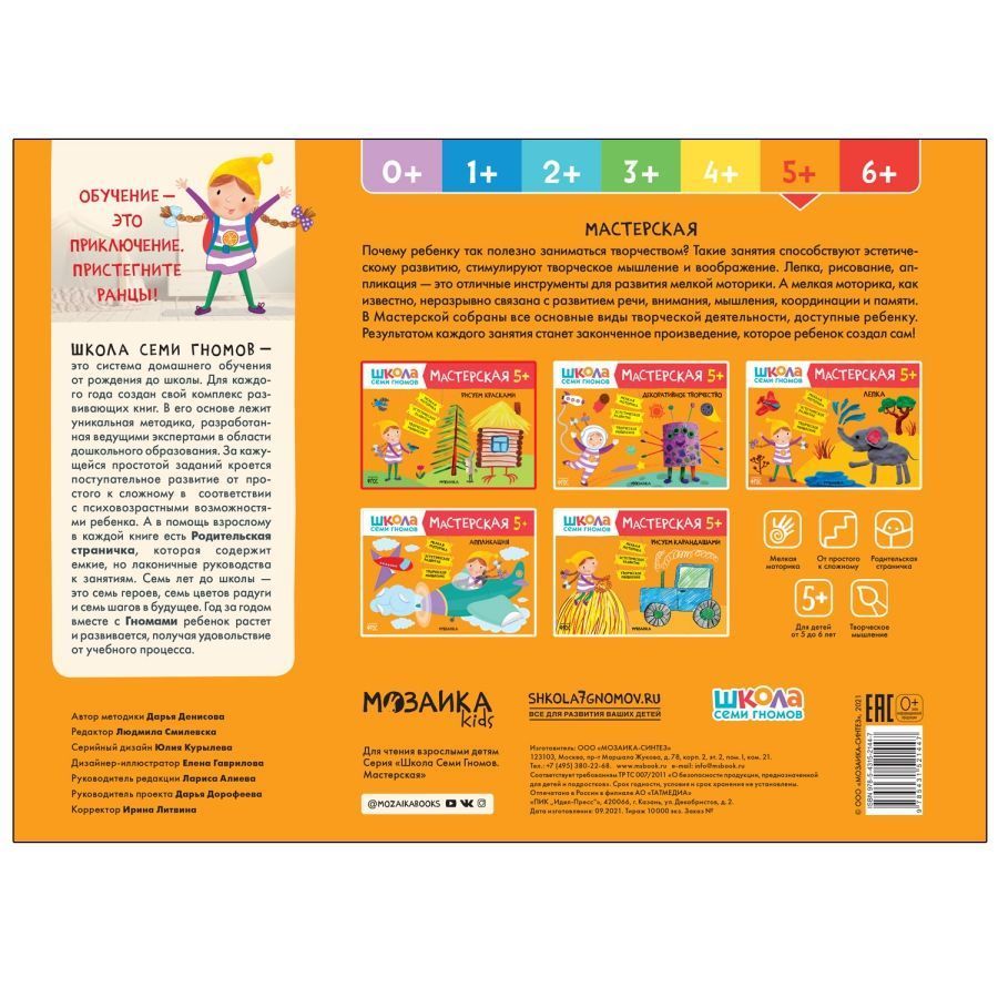 Книга «Рисуем красками 5+» из серии «Школа Семи Гномов. Мастерская» — это красочный альбом для занятий рисованием с ребенком от 5 до 6 лет. Занятия на близкие и понятные ребенку темы расположены по мере усложнения: поступательно переходя от освоения простых навыков к более сложным заданиям, ребенок научится создавать рисунки с помощью красок и кисточки. Результатом каждого занятия станет законченное произведение, которое ребенок создал сам. В конце альбома юного художника ждет большое итоговое задание, где он сможет применить все свои новые умения. Подходящий уровень сложности и полученное удовольствие от занятий — вот залог успешного обучения по системе.Характеристики