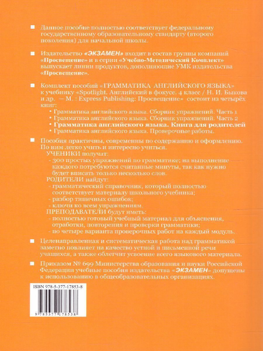 Книга содержит объяснение всех грамматических правил, которые изучаются в 4 классассе, разбор типичных грамматических ошибок и рекомендации по работе над грамматикой. В книгу вклассючены также классючи к упражнениям из Сборника. Для родителей, чьи дети изучают английский язык в 4 классассе по учебнику Н.И. Быковой др. "Spotlight. Английский в фокусе. 4 классасс".Характеристики