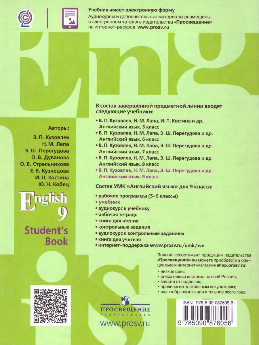 Учебник "Английский язык. 9 класс" авторов В. П. Кузовлева и др. предназначен для учащихся 9 класса общеобразовательных организаций. Материал учебника рассчитан на 3 часа в неделю. Учебник чётко структурирован, он состоит из нескольких разделов, каждый из которых имеет своё название и посвящён определённой сфере британского или американского общества. Темы разделов отобраны с учётом интересов учащихся данного возраста и позволяют не только узнавать что-то новое о культуре Великобритании, США, Канады или Австралии, но и готовят к межкультурному общению. Красочно иллюстрированный учебник содержит аутентичные тексты, разнообразные упражнения для развития навыков аудирования, говорения, чтения и письма, а также задания в тестовом формате для подготовки учащихся к сдаче государственной итоговой аттестации и международных экзаменов. В комплект входят: рабочие программы (5–9 классы), учебник, рабочая тетрадь, книга для чтения, книга для учителя, контрольные задания, аудиокурс к учебнику, аудиокурс к контрольным заданиям, электронная форма учебника.Характеристики