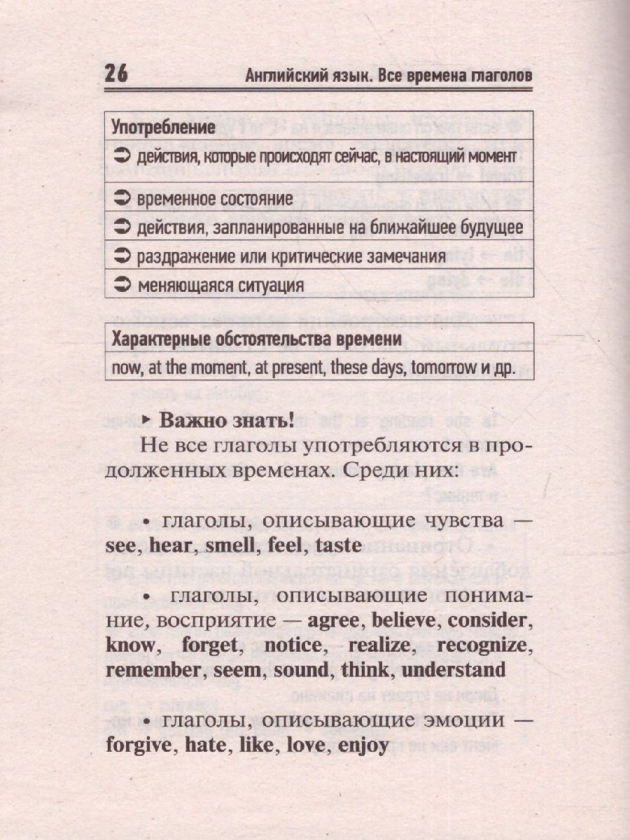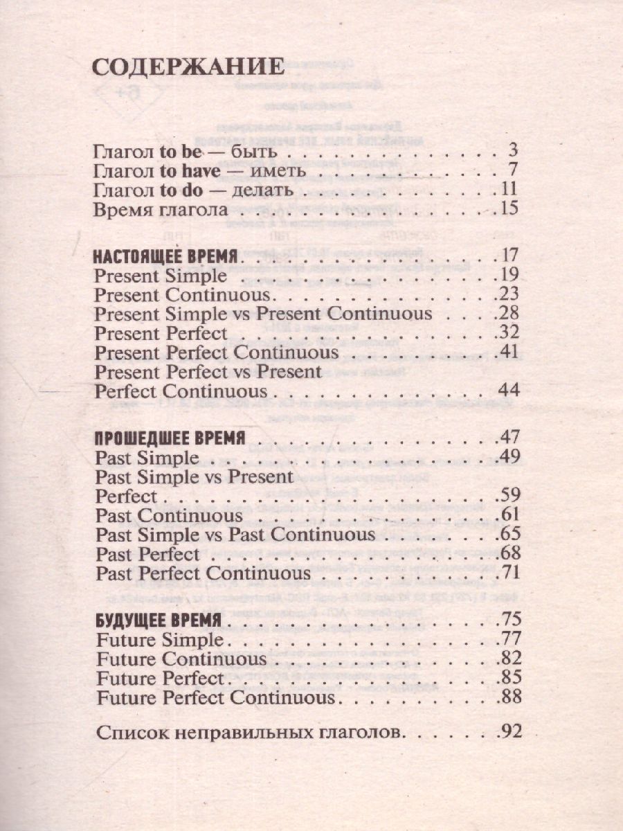 В этом пособии представлены 12 времён английского языка. Они распределены по группам и рассматриваются последовательно, от простого к более сложному. Также в этом издании уделяется внимание сравнению употребления времен. В самом начале этой книги представлены глаголы to be, to have и to do, которые могут являться как смысловыми, так и вспомогательными. А в конце книги вы найдёте таблицу неправильных глаголов. Справочник будет полезен для школьников, студентов, преподавателей и всех тех, кто учит английский язык.Характеристики