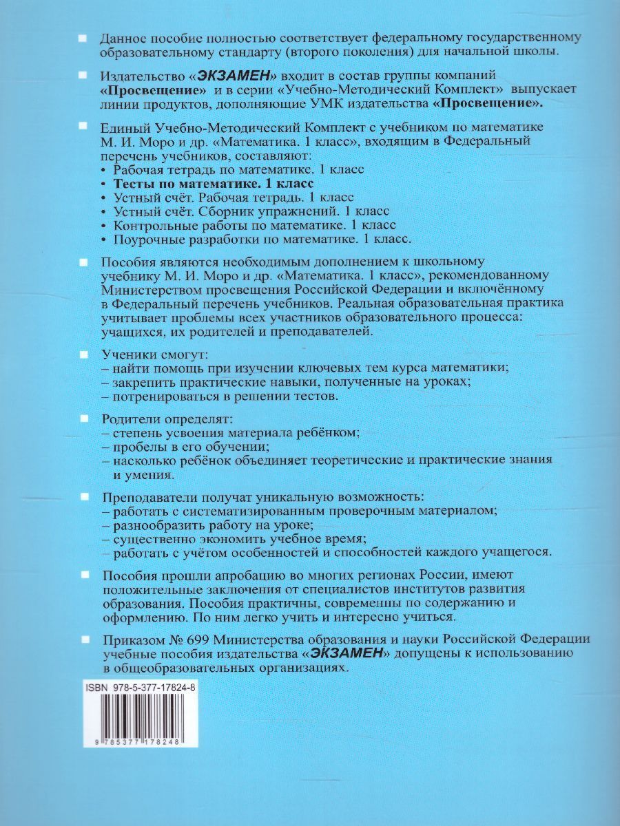 Данное пособие полностью соответствует федеральному государственному образовательному стандарту (второго поколения) для начальной школы. Данный сборник с тестами предназначен для тематического и итогового контроля знаний учащихся по основным разделам учебника "Математика. 1 классасс" (авт. М. И. Моро и др.). Он может быть использован учителями, работающими и по другим комплектам, так как основные темы курсов совпадают. Тесты помогут учащимся в изучении основных тем курса математики, а учителю предоставят систематизированный проверочный материал. Приказом № 729 Министерства образования и науки Российской Федерации учебные пособия издательства "Экзамен" допущены к использованию в общеобразовательных организациях. 19-е издание, переработанное и дополненное.Характеристики