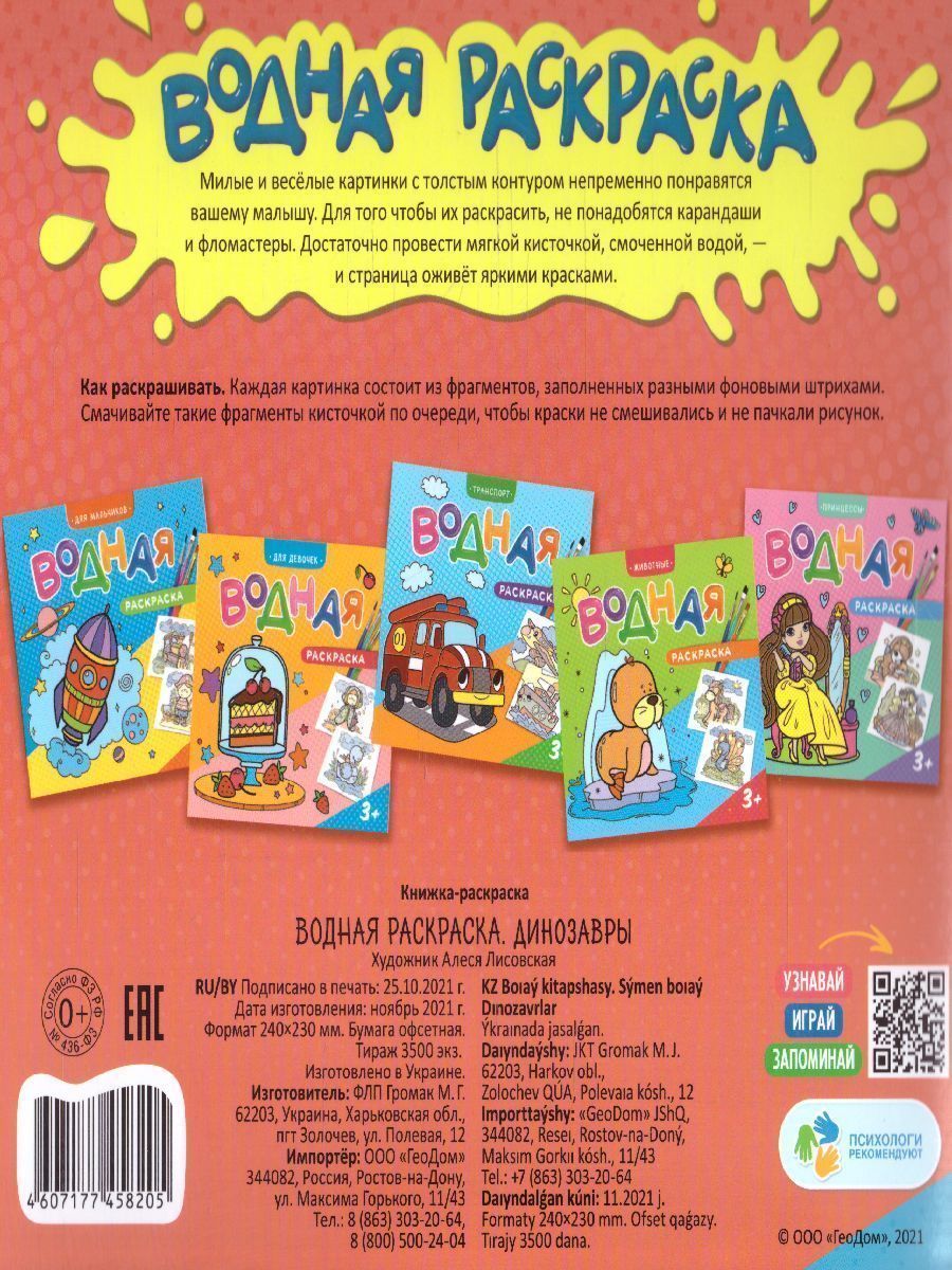 Юный любитель динозавров ещё не умеет рисовать, но уже очень хочет? Ему точно придётся по душе водная раскраска «Динозавры», а вам – чистые стены, ведь краски не потребуются! Проведите по картинке смоченной в воде кисточкой – и забавные дино оживут на странице! Раскраска способствует развитию творческого мышления и мелкой моторики и весело знакомит малыша с миром динозавров.Характеристики