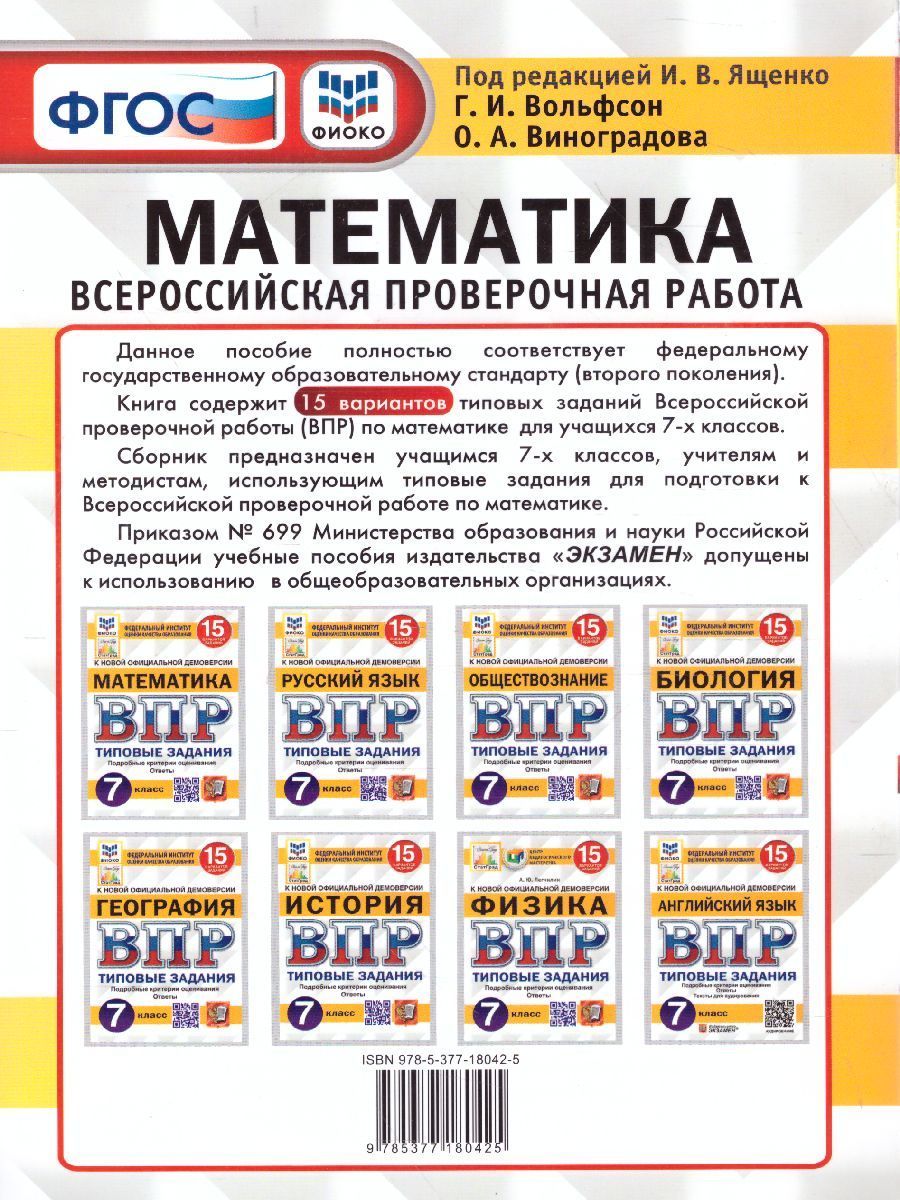 ВПР. Математика 7 класс. 15 вариантов. ФИОКО СТАТГРАД ТЗ ФГОС