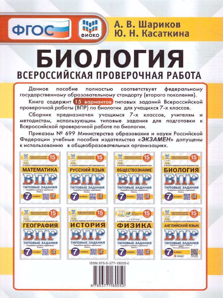ВПР Биология 7 класс. 15 вариантов. ФИОКО СТАТГРАД ТЗ ФГОС