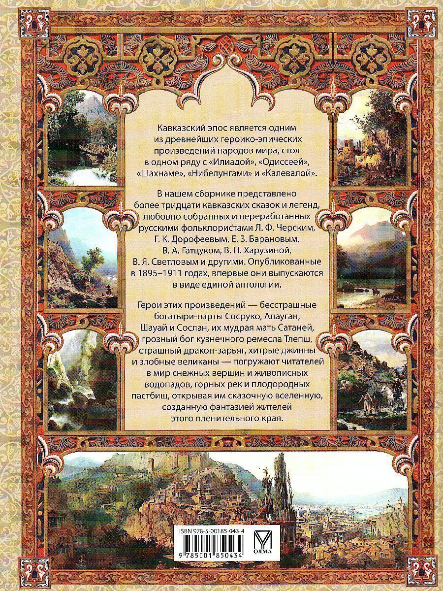 Кавказский эпос является одним из древнейших героико-эпических произведений народов мира, стоя в одном ряду с "Илиадой", "Одиссеей", "Шахнаме", "Нибелунгами" и "Калевалой". В нашем сборнике представлено более тридцати кавказских сказок и легенд, любовно собранных и переработанных русскими фольклористами Л. Ф. Черским, Г. К. Дорофеевым, Е. 3. Барановым, В. А. Гатцуком, В. Н. Харузиной, В. Я. Светловым и другими. Опубликованные в 1895-1911 годах, впервые они выпускаются в виде единой антологии. Герои этих произведений - бесстрашные богатыри-нарты Сосру- ко, Алауган, Шауай и Сослан, их мудрая мать Сатаней, грозный бог кузнечного ремесла Тлепш, страшный дракон-зарьяг, хитрые джинны и злобные великаны - погружают читателей в мир снежных вершин и живописных водопадов, горных рек и плодородных пастбищ, открывая им сказочную вселенную, созданную фантазией жителей этого пленительного края.Характеристики