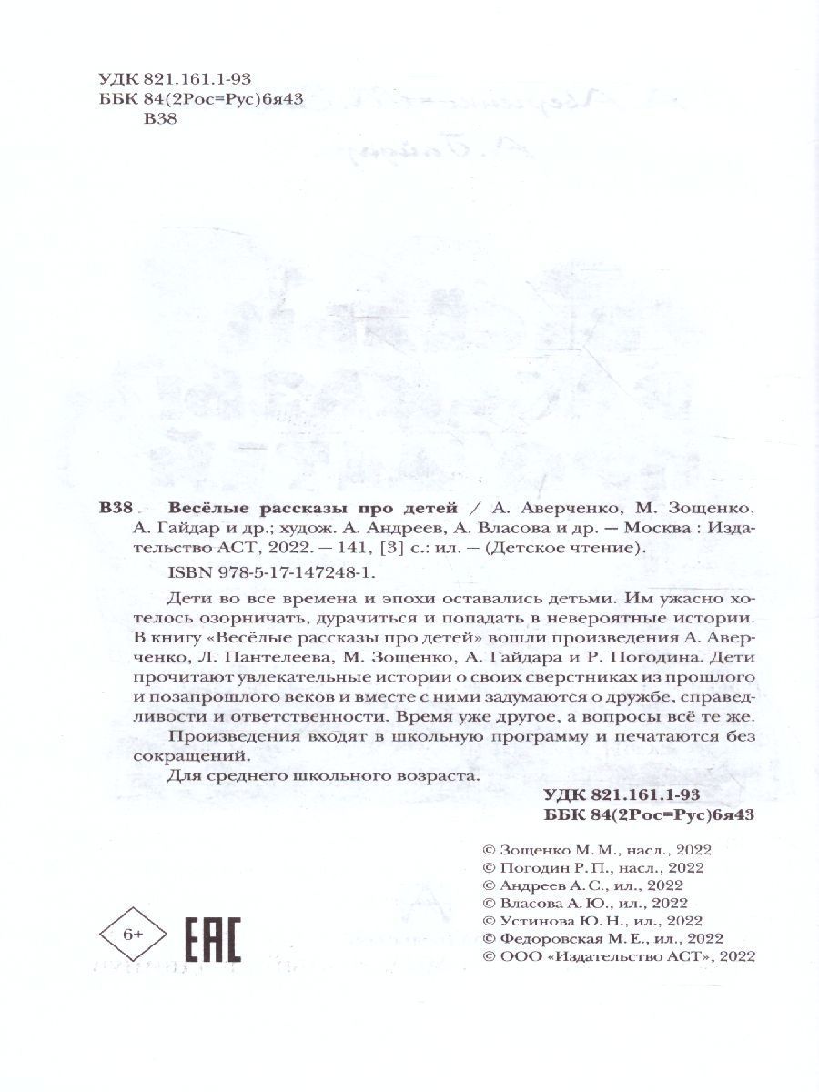 Дети во все времена и эпохи оставались детьми. Им ужасно хотелось озорничать, дурачиться и попадать в невероятные истории. В книгу "Весёлые рассказы про детей" вошли произведения А. Аверченко, Л. Пантелеева, М. Зощенко, А. Гайдара и Р. Погодина. Дети прочитают увлекательные истории о своих сверстниках из прошлого и позапрошлого веков и вместе с ними задумаются о дружбе, справедливости и ответственности. Время уже другое, а вопросы всё те же. Произведения входят в школьную программу и печатаются без сокращений. Для младшего школьного возраста.Характеристики
