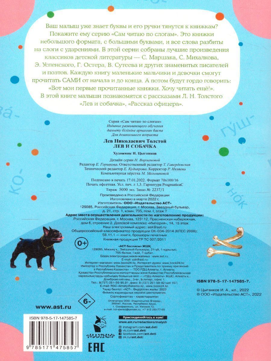 Ваш малыш уже знает буквы и его ручки тянутся к книжкам? Покажите ему серию «Сам читаю по слогам». Это книжки небольшого формата, с большими буквами, и все слова разбиты на слоги с ударениями. В этой серии собраны лучшие произведения классиков детской литературы — С. Маршака, С. Михалкова, Э. Успенского, Г. Остера, В. Сутеева и других знаменитых писателей и поэтов. Каждую книгу маленькие мальчики и девочки смогут прочитать САМИ от начала и до конца. А потом будут гордо говорить: «Вот мои первые прочитанные книжки. Хочу читать ещё!». В этой книге малыши познакомятся с рассказами Л. Н. Толстого «Лев и собачка», «Рассказ офицера». Для дошкольного возраста.Характеристики