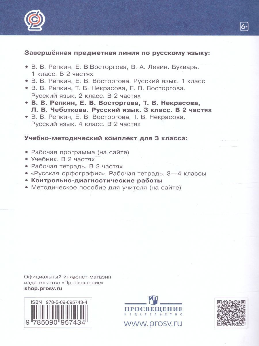 Русский язык 3 класс. Контрольно-диагностические работы. УМК "Русский язык. Репкин В.В.(1-4)(система Эльконина-Давыдова)". ФГОС. Контрольные и проверочные работы для 3 класса предназначены для текущей и итоговой проверки знаний учащихся по русскому языку. Все задания рассчитаны на базовый и повышенный уровни усвоения программного материала в соответствии с ФГОС начального общего образования. Тетрадь для контрольных и проверочных работ может быть использована учителем в работе с УМК по русскому языку авторов В. В. Репкина, Е. В. Восторговой, Е. В. Некрасовой и др. Тетрадь для 3 класса предназначена для проверки и контроля знаний учащихся о языке и речи, для диагностики способности учащихся определять границы своих собственных знаний, а также для проверки уровня сформированности таких действий, как моделирование, контроль и оценка. Тетрадь содержит стартовую проверочную работу, тематические и итоговые контрольные работы, а также материал для контрольного списывания и контрольных диктантов. Представленные в тетради тексты включают все основные темы программного материала.Характеристики